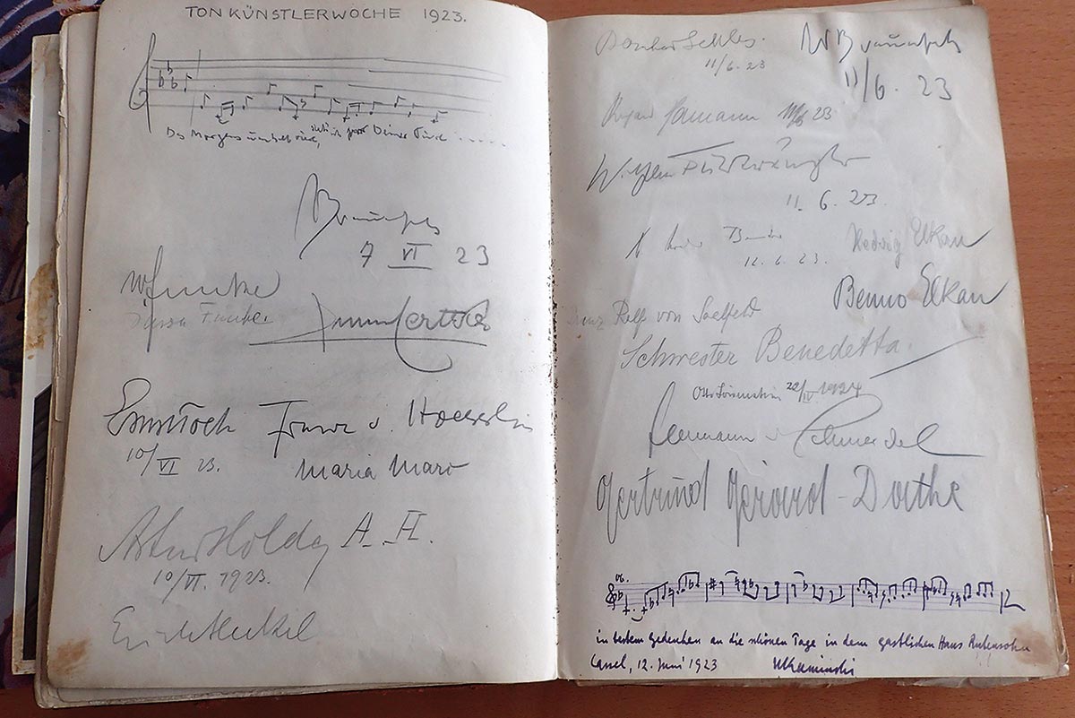 - Doppelseite aus dem Gästebuch von Emmy und Ernst Rubensohn mit Einträgen anlässlich der Kasseler Tonkünstlerwoche 1923. Die Einträge stammen unter anderem von Wilhelm Furtwängler, Ernst Toch und Bernhard Sekles.