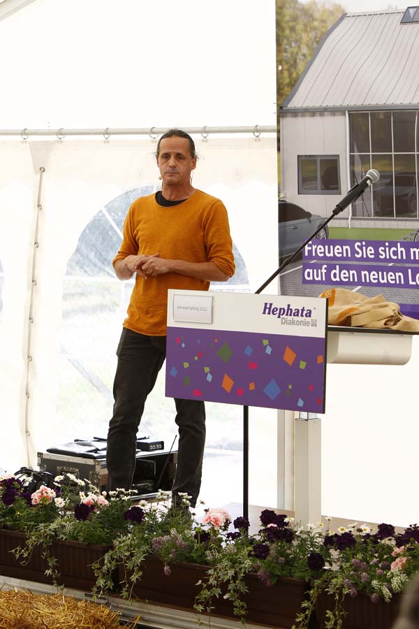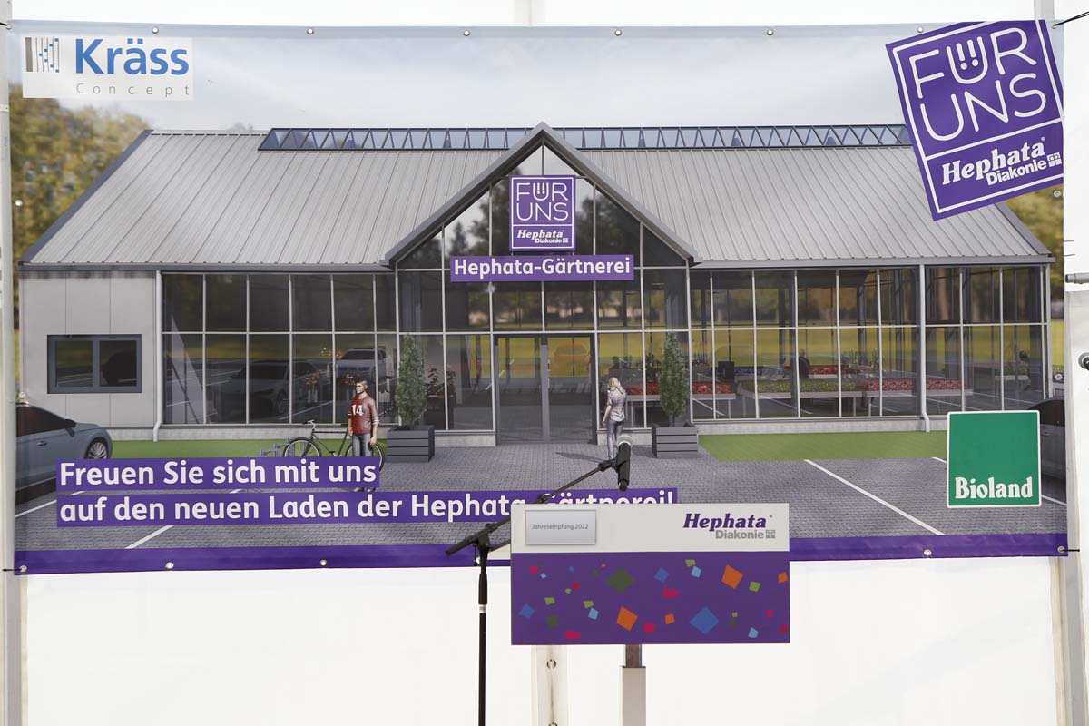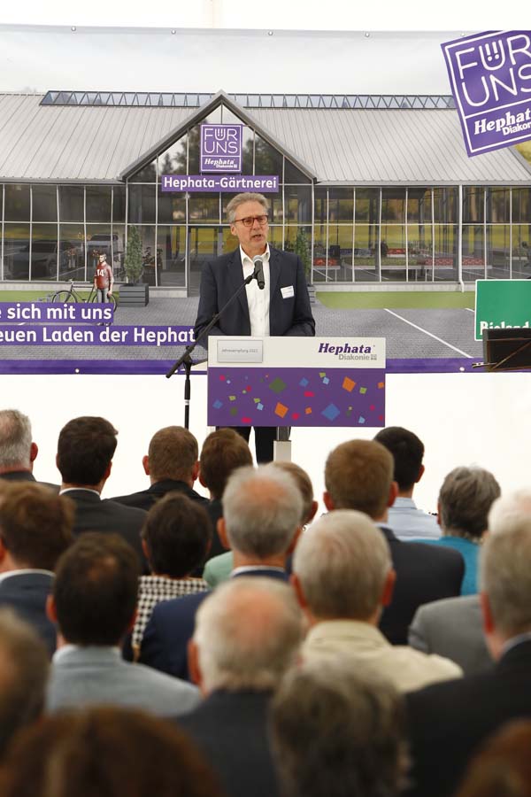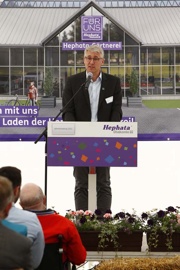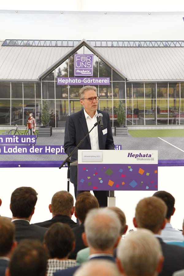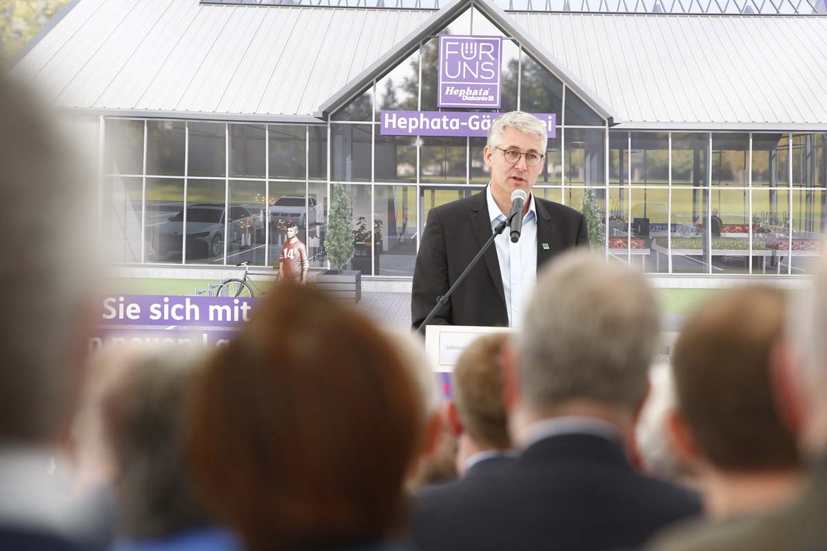 Am Freitagvormittag trafen sich Gäste und Gastgeber in ungezwungener Atmosphäre im überdachten und bestuhlten Festzelt an der Hephata-Gärtnerei, an der ein neues Gebäude für den Verkauf entsteht. Jan Platte, Präsident des Bioland-Bundesverbands, hielt einen Impulsvortrag zum Thema der sozialen und ökologischen Landwirtschaft. Zuvor begrüßte aber Dietrich-Gibhardt die vielen Gäste aus Landes-, Kreis- und Stadtpolitik sowie Vertreter der Evangelischen Kirche von Kurhessen-Waldeck, Vertreter der Hochschule Darmstadt sowie Partner aus Wirtschaft, Finanzwesen und Handwerk.
