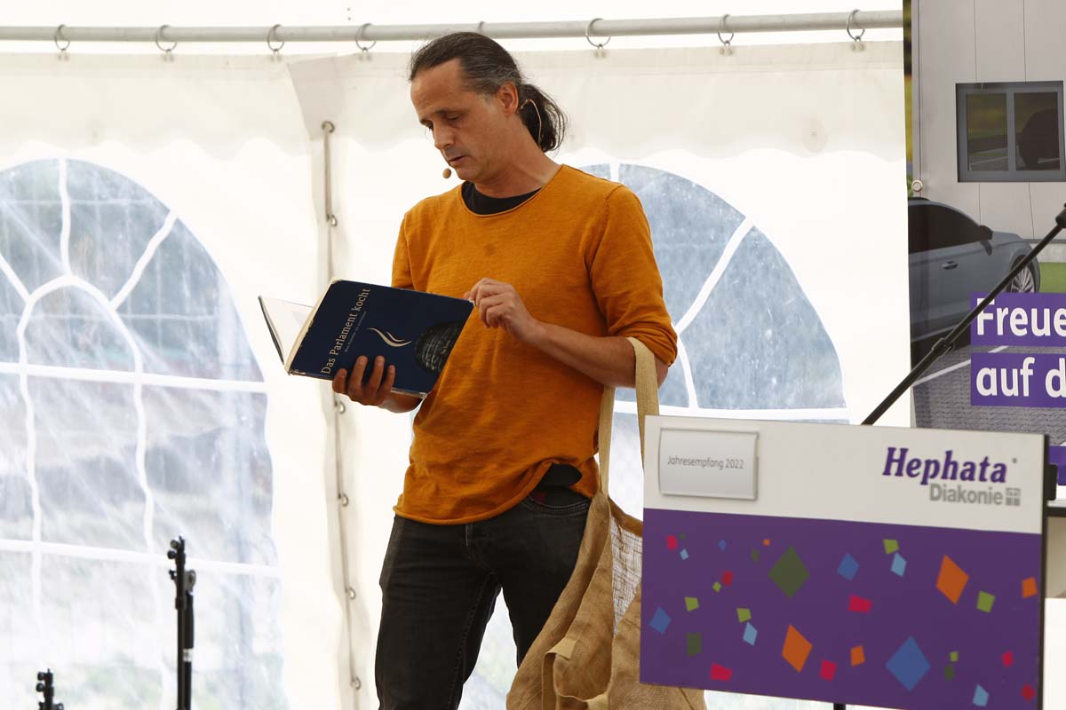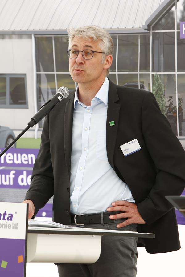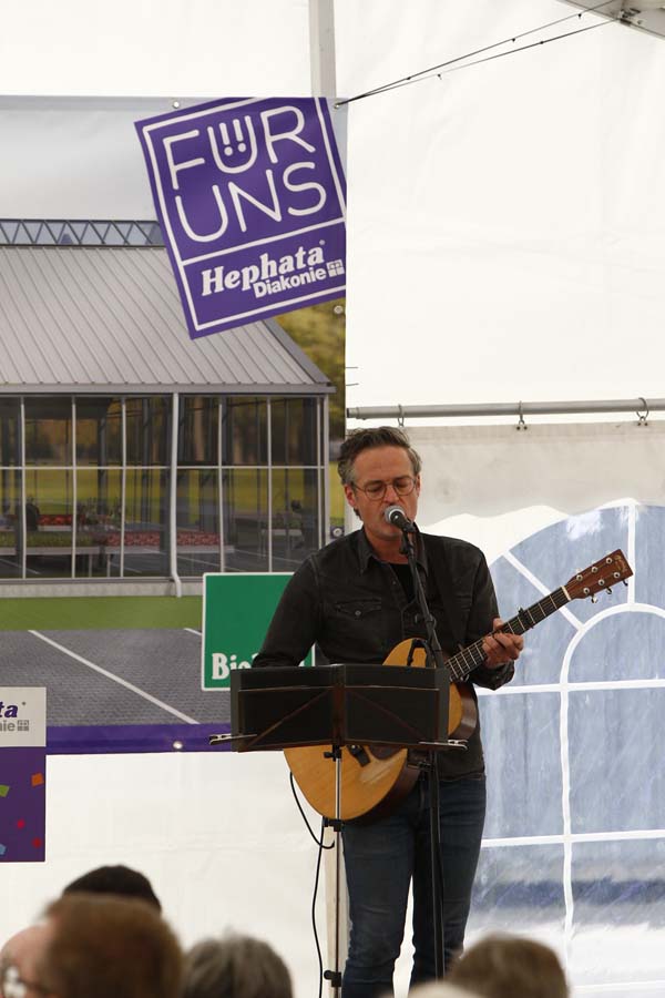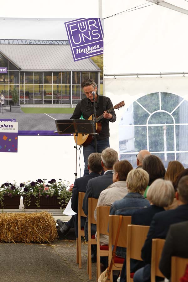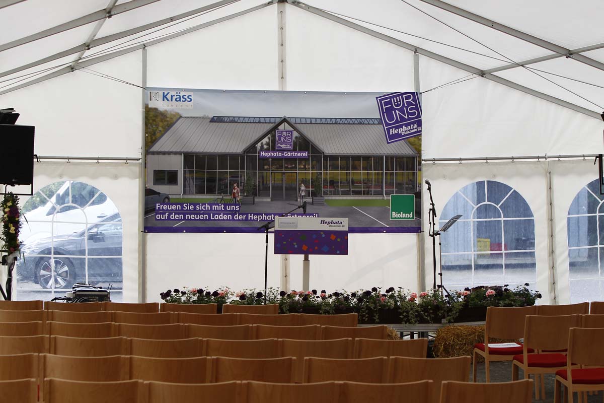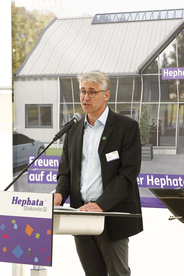 Am Freitagvormittag trafen sich Gäste und Gastgeber in ungezwungener Atmosphäre im überdachten und bestuhlten Festzelt an der Hephata-Gärtnerei, an der ein neues Gebäude für den Verkauf entsteht. Jan Platte, Präsident des Bioland-Bundesverbands, hielt einen Impulsvortrag zum Thema der sozialen und ökologischen Landwirtschaft. Zuvor begrüßte aber Dietrich-Gibhardt die vielen Gäste aus Landes-, Kreis- und Stadtpolitik sowie Vertreter der Evangelischen Kirche von Kurhessen-Waldeck, Vertreter der Hochschule Darmstadt sowie Partner aus Wirtschaft, Finanzwesen und Handwerk.