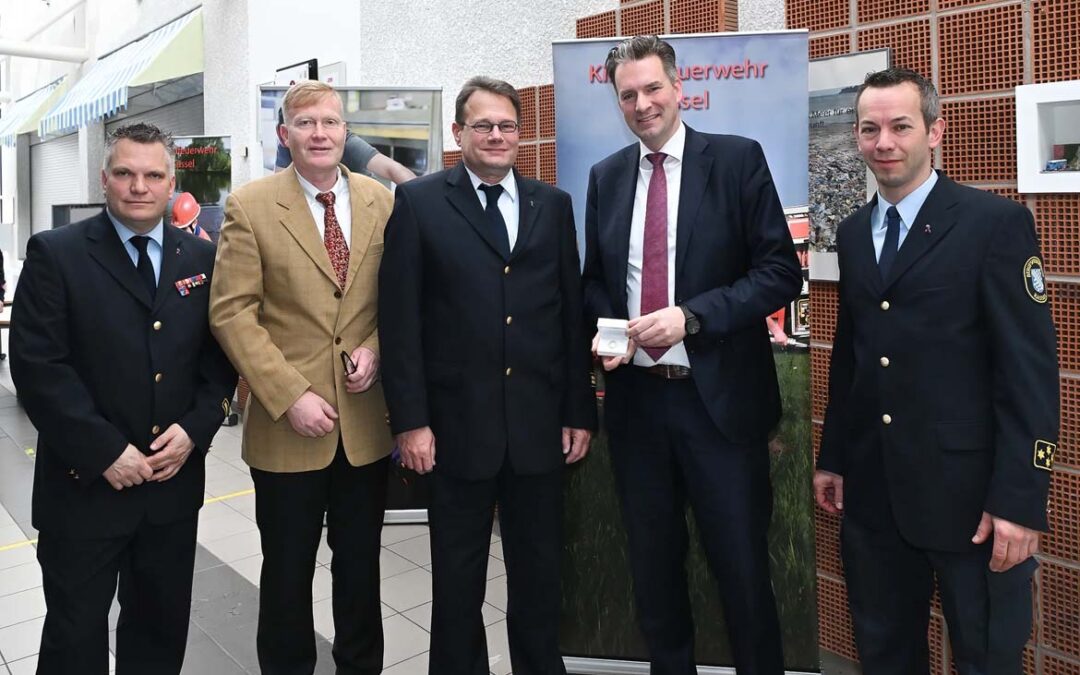 Zum Abschluss der Veranstaltung überreichte Stadtrat Lehmkuhl die silberne Ehrennadel als Zeichen des Dankes für Straßers langjähriges Engagement. Sein Nachfolger im Amt des Stadtbrandinspektors wird Kai Knierim.