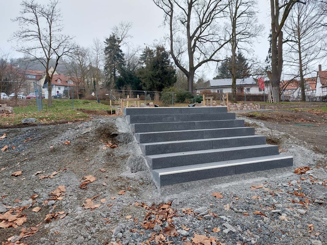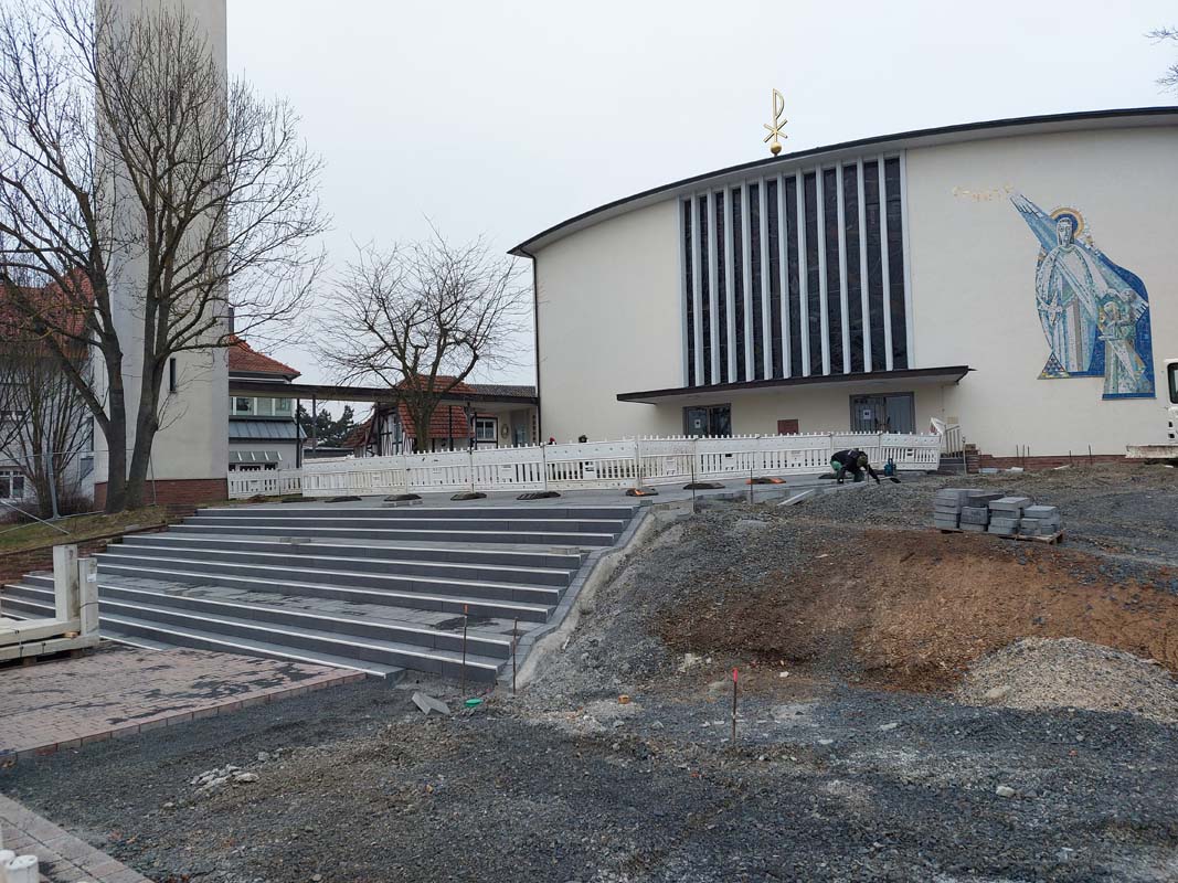 Beim Ortstermin am 4. Februar informierte Umwelt­ingenieurin Janina Heinemann über den aktuellen Stand der Arbeiten. Der obere Kirchvorplatz mit Treppe ist nahezu fertig, die Freigabe soll Ende März nach Installation der Handläufe erfolgen. Der barrierefreie Zugang zur Kirche wird nach Umverlegung einer Wasserleitung gebaut. Zudem erhält der untere Vorplatz eine neue Bepflanzung, eine Sitzgelegenheit und eine neu positionierte Treppe.