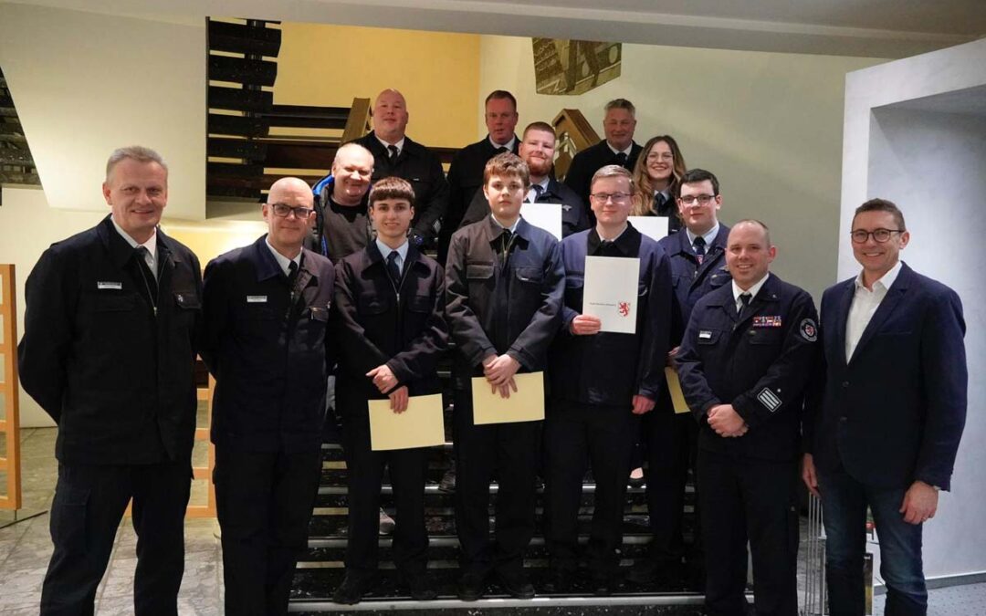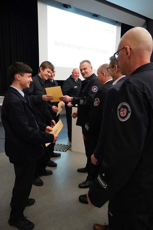 Jugendfeuerwehrmitglieder Fynn Kassebeere und Luca Nagel wurden feierlich in das Übergangsjahr in die Einsatzabteilung übergeben. Im Übergangsjahr sind die Jugendlichen noch aktiv in der Jugendfeuerwehr, dürfen aber auch am Übungsdienst in der Einsatzabteilung teilnehmen.