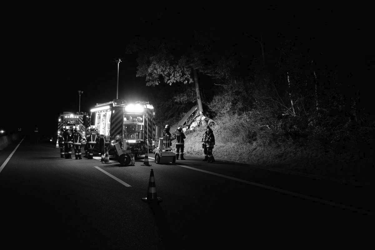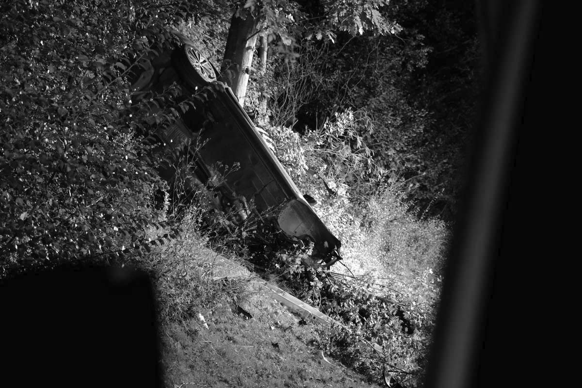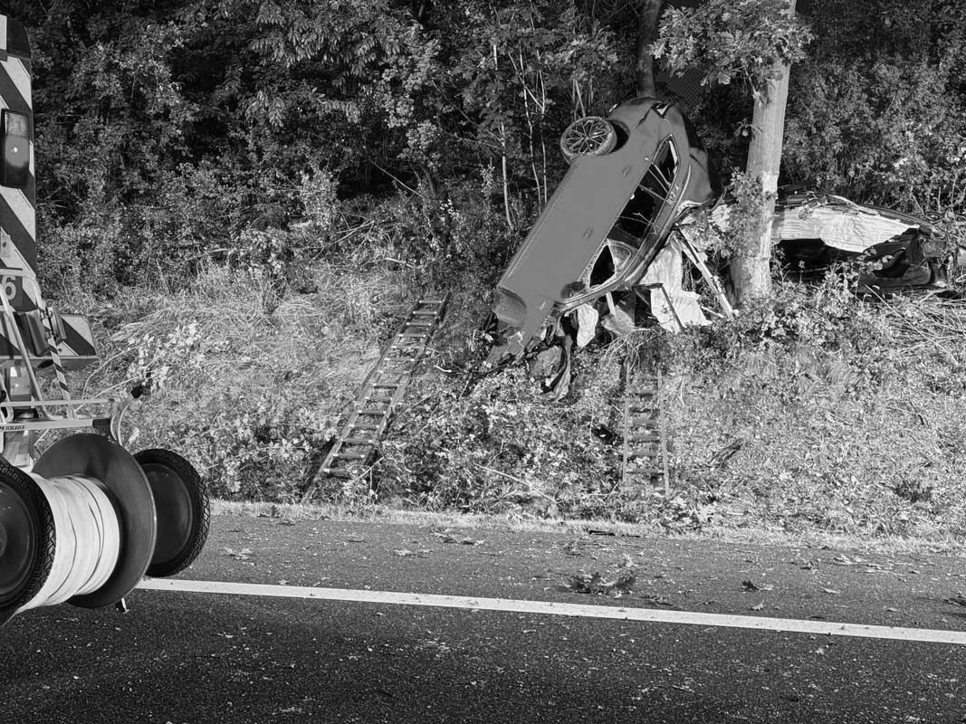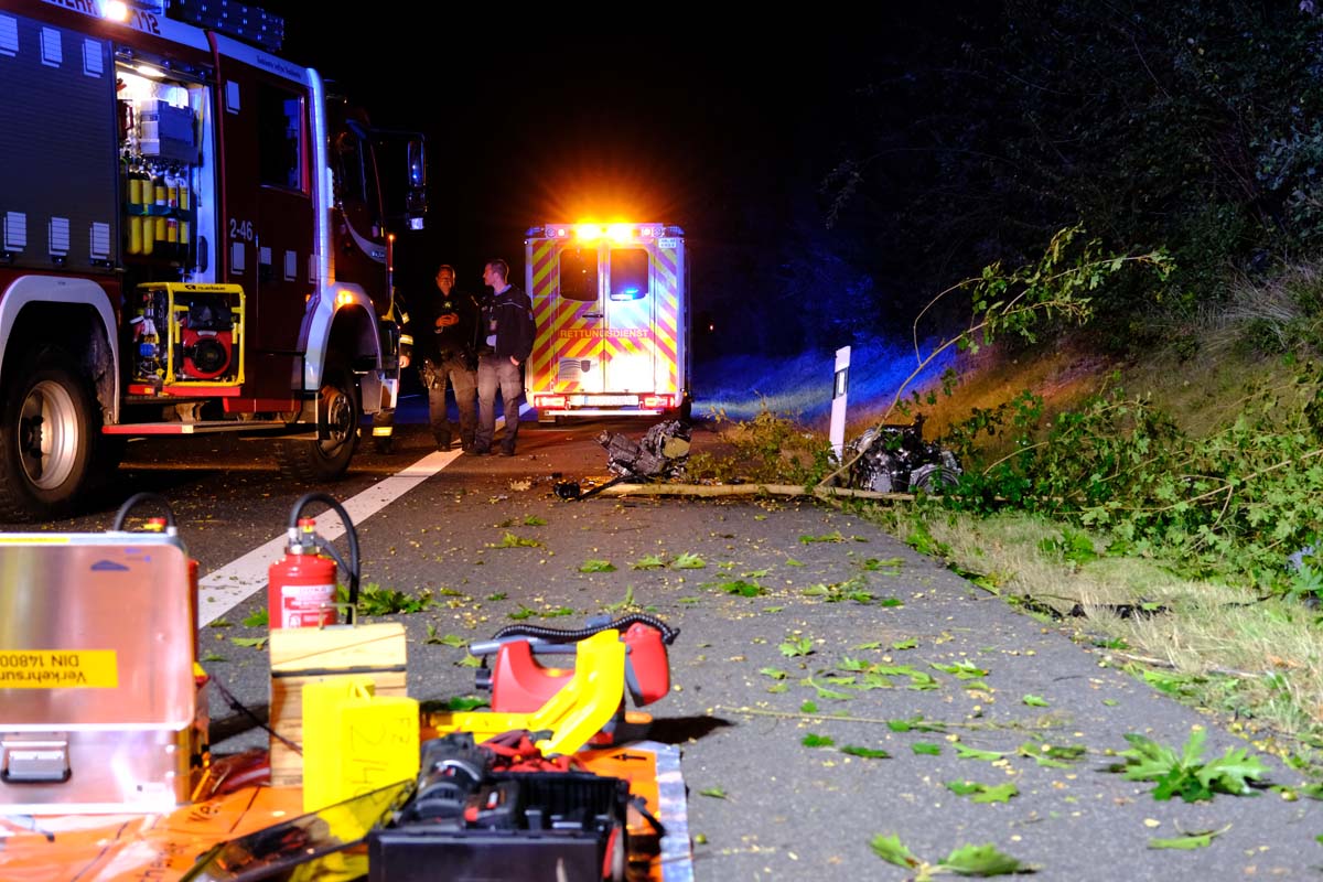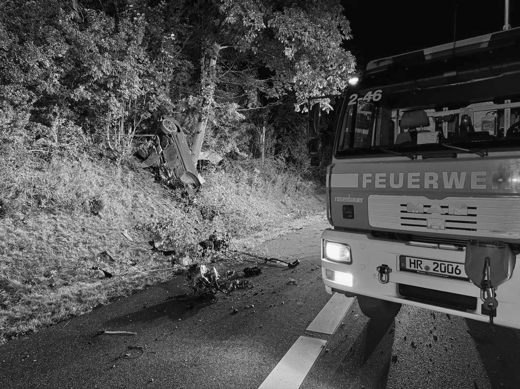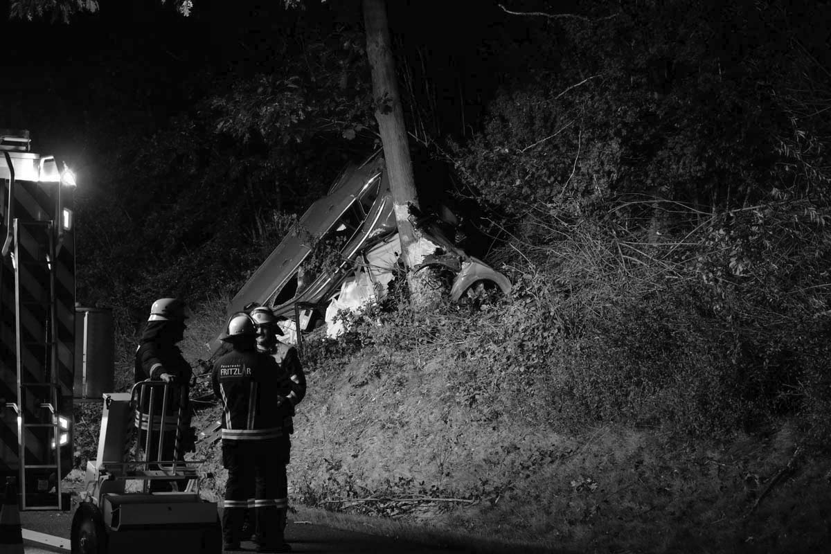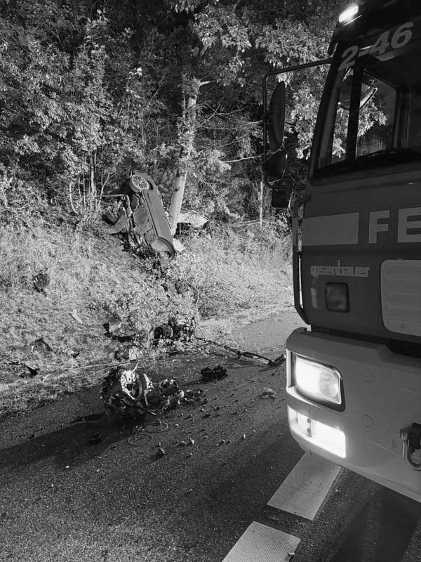 Aus bisher ungeklärter Ursache kam der Pkw auf einem geraden Streckenabschnitt von der Fahrbahn ab, fuhr etwa 50 Meter die Böschung und dem Buschwerk entlang und prallte dann ungebremst frontal gegen einen Baum.