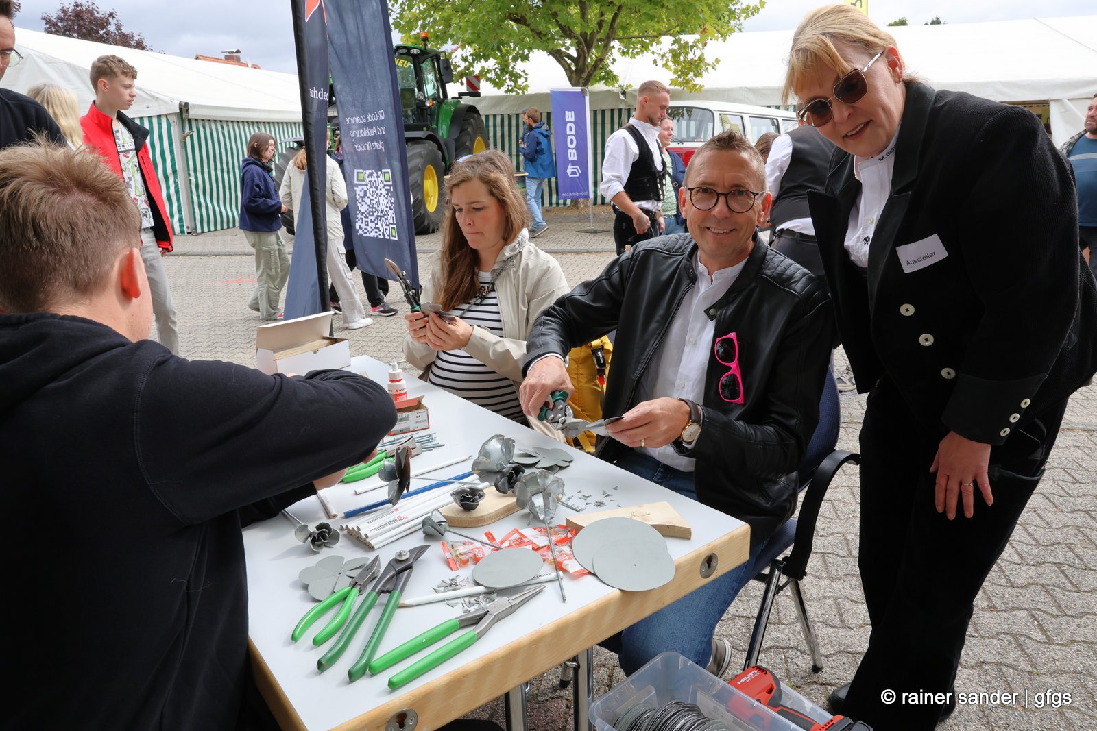 Wer durch die Halle, zwei Zelte und den Außenbereich schlendert, bekommt einen Eindruck davon, wie viele und vielfältige Chancen der Arbeits- und Ausbildungsmarkt der Region bietet. Es gibt immer weniger gute Gründe für junge Menschen, das Weite zu suchen. In der Heimat geht vieles und zahlreiche hoch spezialisierte Betriebe bieten spannendere Tätigkeiten, als man in manchen Ballungszentren zu erwarten hat. Auf der Messe wurde auch ganz praktisch frisiert, gehämmert und geschraubt. Bürgermeister Marcel Pritsch ließ sich von Marion Schaake in die Kunst des Dachdeckens einführen. Geschick bewies er beim Fertigen einer Rosette.