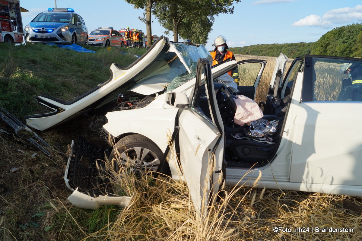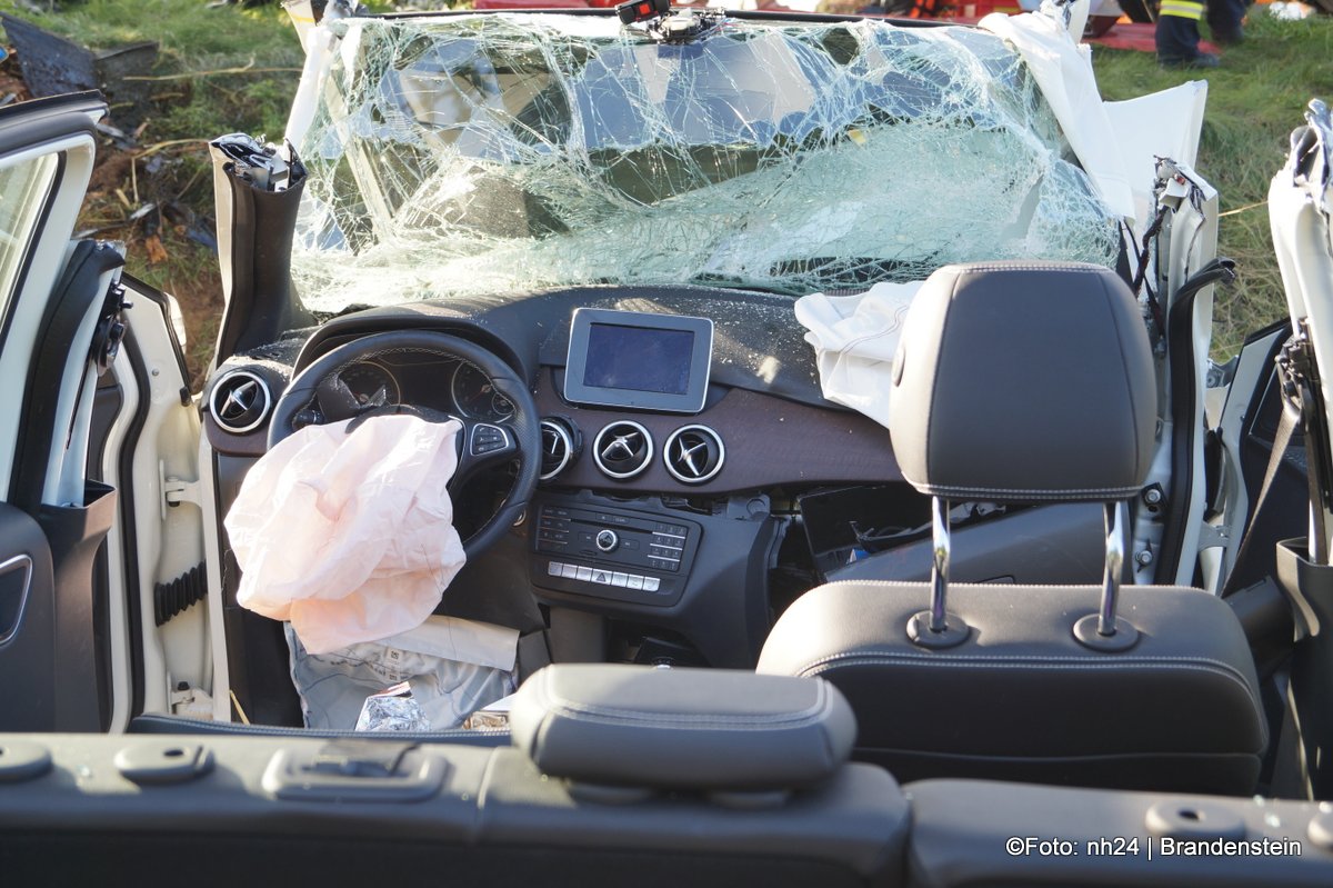 Sie wurde glücklicherweise nicht in dem Unfallwagen eingeklemmt. Die Helfer von Feuerwehr und Rettungsdienst holten sie schonend aus dem Pkw, wobei das Dach des Autos entfernt werden musste.