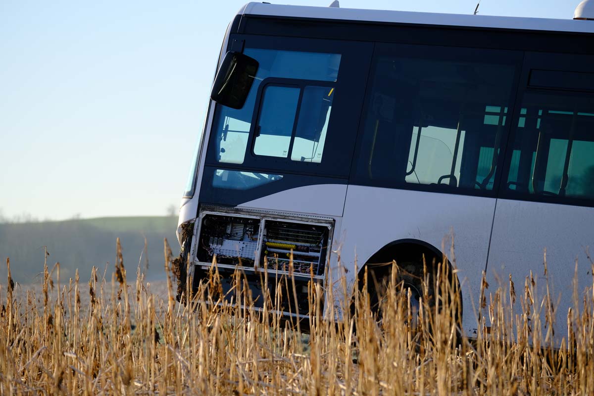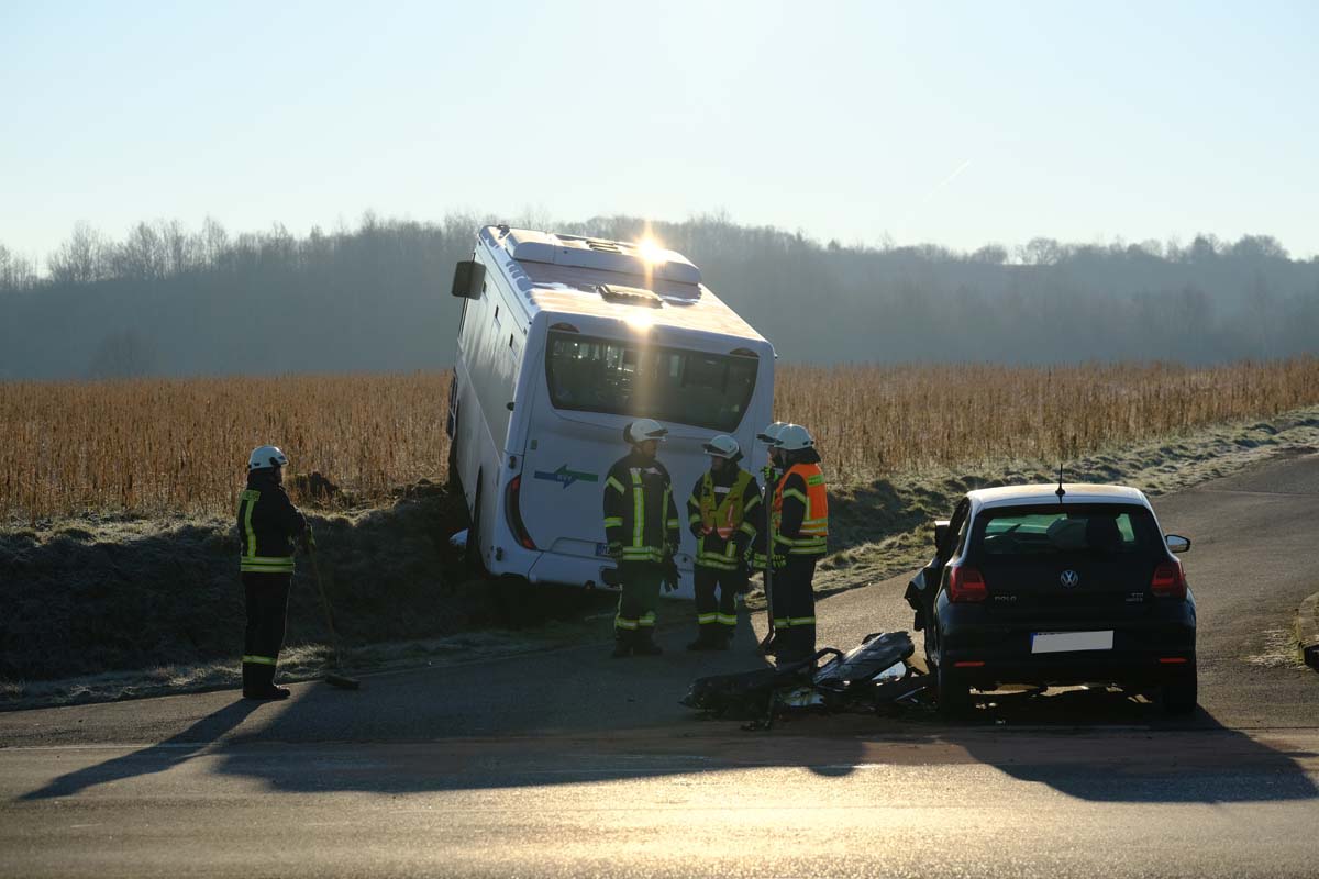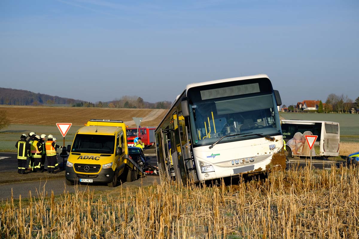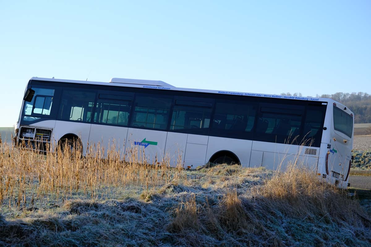 Wie ein Polizeisprecher berichtet, wollte der Busfahrer gegen 7:45 Uhr von Mosheim kommend nach links auf die Landesstraße in Richtung Melsungen abbiegen, wobei er den von links kommenden und vorfahrtsberechtigten Pkw der 32-Jährigen übersah, die in Richtung Homberg fuhr. Der Pkw prallte frontal gegen die vordere linke Seite des Busses. Durch den Aufprall verlor der 63-Jährige die Kontrolle über den Bus und fuhr geradeaus auf ein Stoppelfeld. Der Pkw kam auf der Gegenfahrbahn zum Stillstand.