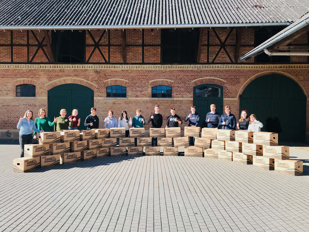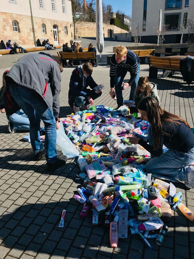 Jede Klasse hat im Verlauf der letzten Woche eine Kiste bekommen. Die Idee: Jeder bringt einen Hygieneartikel seiner Wahl mit. Der Einsatz war für jeden Einzelnen gering, aber bei 1200 Schülerinnen und Schülern besonders effektiv.