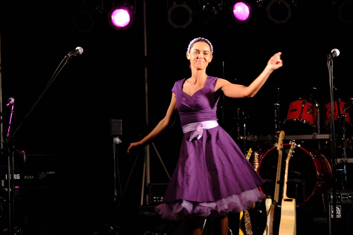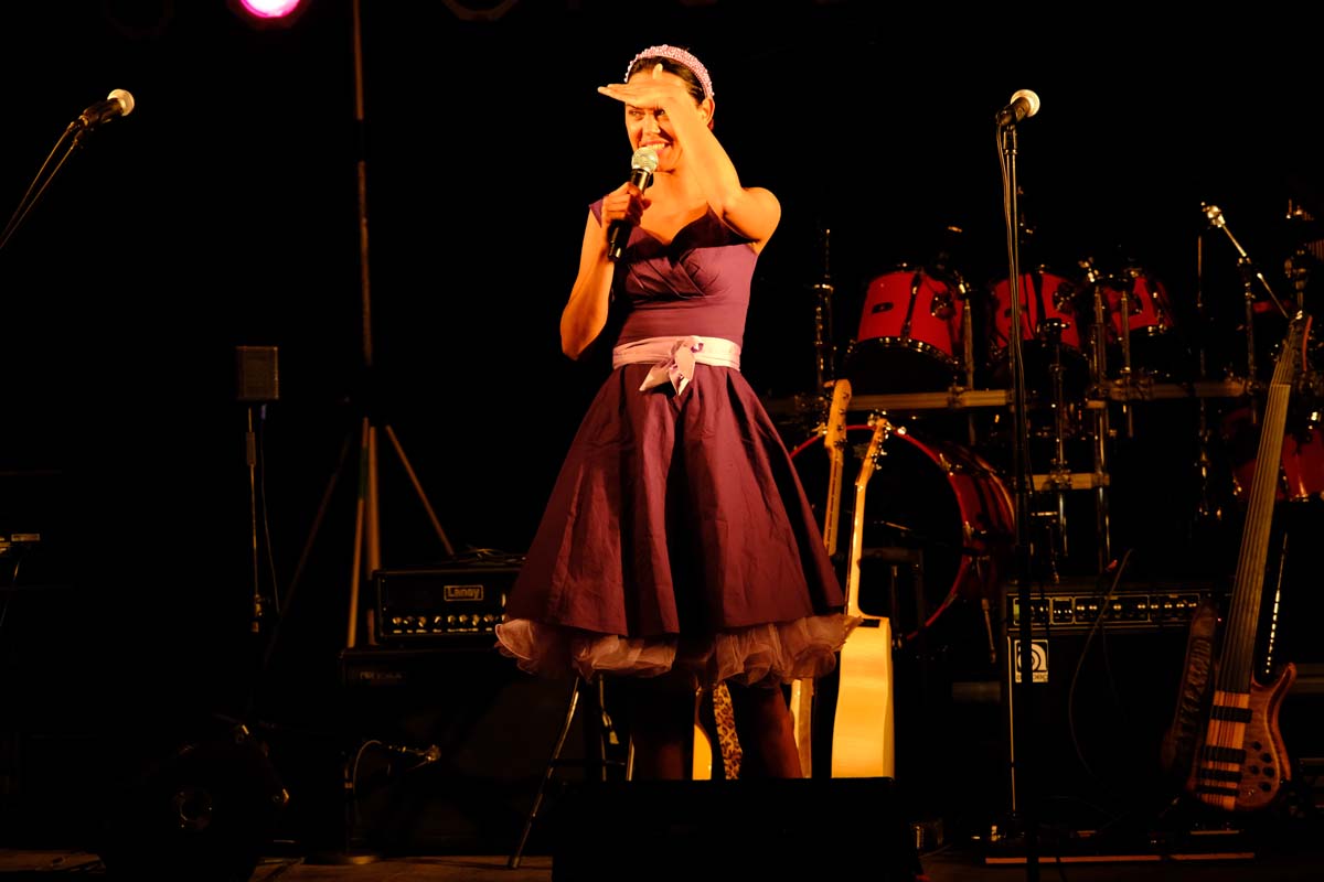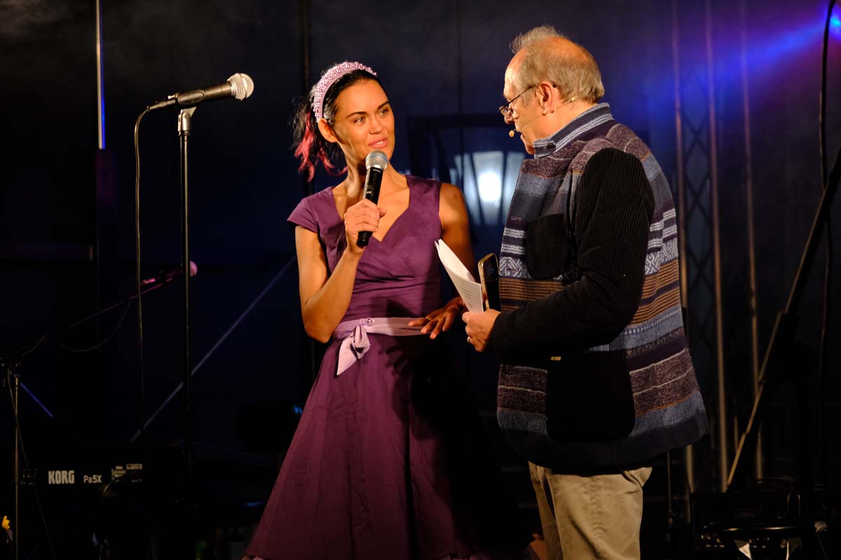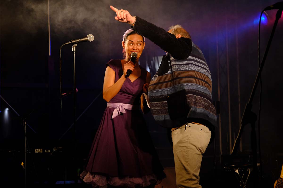 Gegen 21:00 Uhr begann die große Party am Marktplatz. Vanessa Neigert fegte unbekümmert fröhlich und wie ein Wirbelwind über die Bühne und mühte sich von Beginn an, das Publikum in Bewegung zu bringen. Bei ihrem Hit Volare gleich zu Beginn, sangen die ersten lautstark mit. Die Stimmung war gut, die Sängerin auch, aber es dauerte ein Weilchen, bis die ersten Besucher vor der Bühne tanzten. Eine gute halbe Stunde lang zog die 32-Jährige – bekannt aus DSDS und Fernsehgarten – alle Register mit Schlagern aus den Fünfziger- und Sechzigerjahren. „Liebeskummer lohnt sich nicht“ oder „Gefühle sterben niemals“ gehören genauso zu ihrem Programm wie „Zwei kleine Italiener“. Gemeint waren in Schwalmstadt sicher nicht Romano und Giorgio … Dafür waren Papa und Tochter mit dabei. Heute ist sie noch einmal auf der Bühne zu sehen und zu hören.