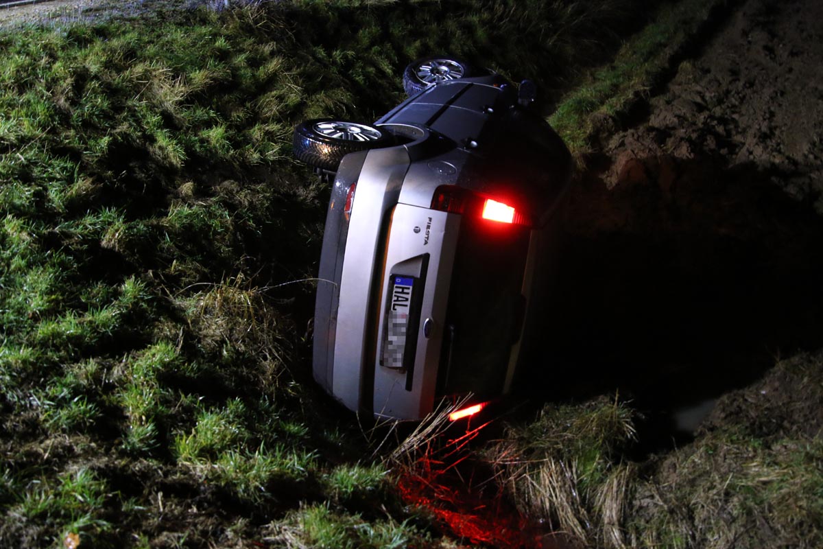 Der Pkw mit den fünf Insassen, der 47 Jahre alte Fahrer aus Halle (an der Saale) und seine vier Mitfahrer im Alter zwischen 19 und 29 Jahren, war auf dem abschüssigen Streckenabschnitt von Holzburg kommend in Richtung der Kreisstraße zwischen Röllshausen und Merzhausen unterwegs. Zur Unfallzeit regnete es stark. Das Fahrzeug geriet im Kreuzungsbereich außer Kontrolle, überquerte die Fahrbahn und rutschte in der Folge einen niedrigen Abhang hinunter in ein Feld. Dort kam der Pkw auf der rechten Seite zum Liegen. Der 47-Jährige erlitt schwere, keine lebensbedrohlichen Verletzungen. Die Mitfahrer wurden leicht verletzt.