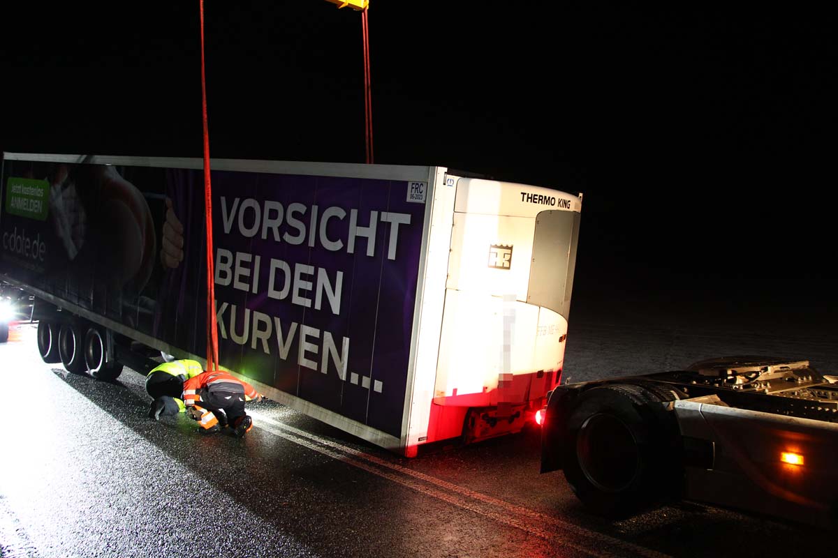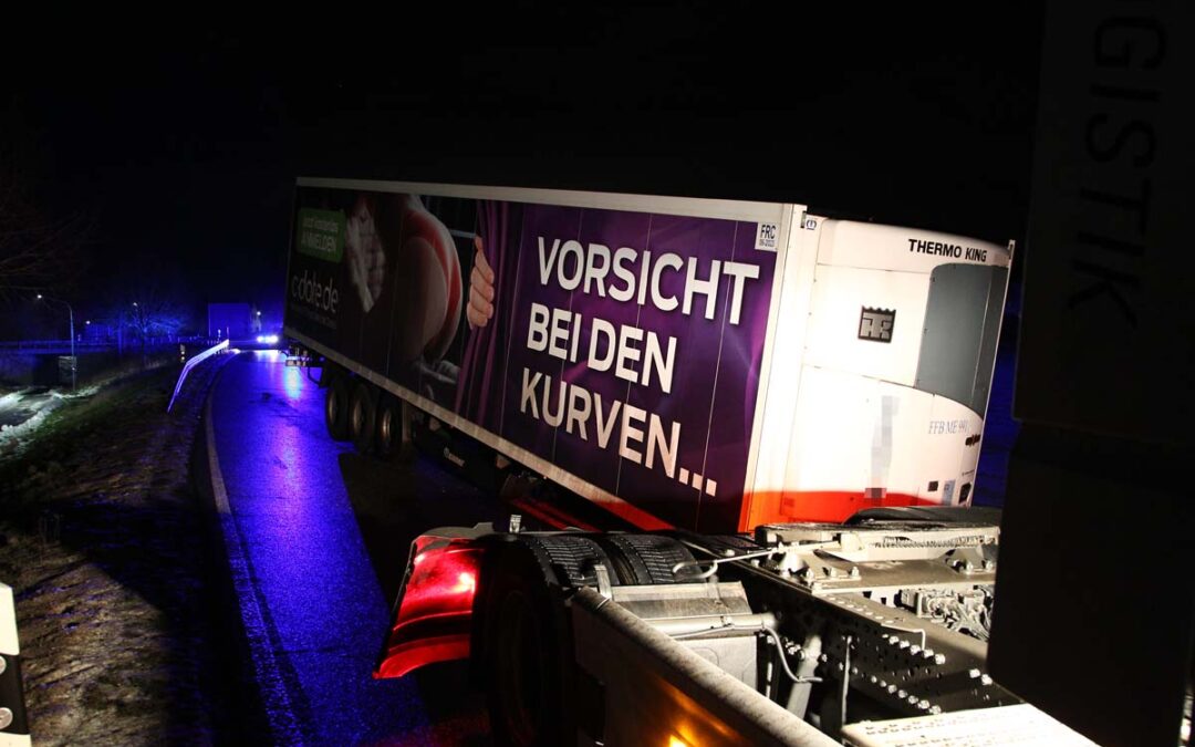 Nach Angaben des Fahrers aus dem Landkreis Freising (25) hatte er bei einer Spedition in Schwalmstadt aufgesattelt. Nur wenige Meter nach dem Kreisel löste sich der Auflieger von der Zugmaschine der bayerischen Spedition. Der Auflieger schlug auf, hinterließ dabei eine tiefe Furche in der Fahrbahn und rutschte wenige Meter auf die gegenüberliegende Fahrspur, wo er zum Stillstand kam. In dem Auflieger befanden sich sieben bis neun Tonnen Ladung.