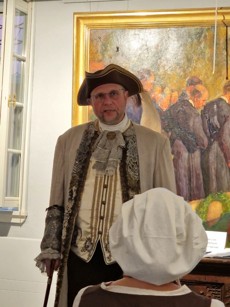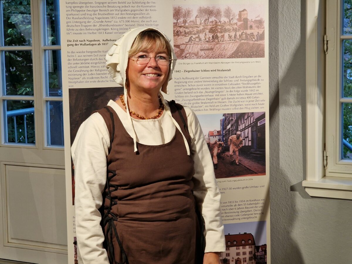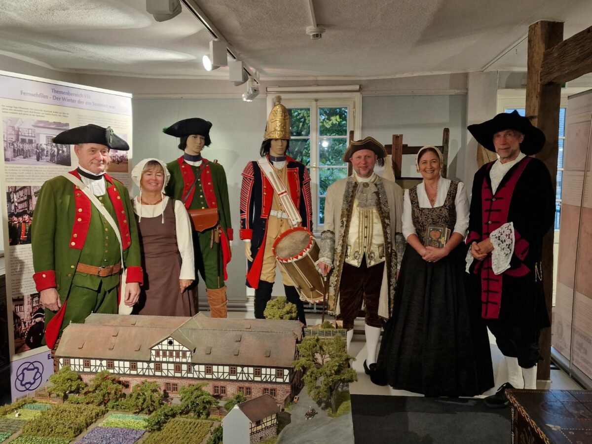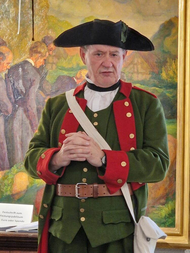 Ein besonderes Highlight der Vernissage war das Erscheinen mehrerer Akteure in stilechter historischer Gewandung. Bernd Völker, Vorsitzender des Arbeitskreises Festung, trat als Landgraf auf, während Aribert Ley als hessischer Soldat des 18. Jahrhunderts beeindruckte. Auch die Stadtführer der Festung waren vertreten: Gabriele Franke als Kunigunde von Lüder, Bernd Bick in der Rolle des Landgrafen und Tanja Görres als Schankwirtin Johanna. Diese