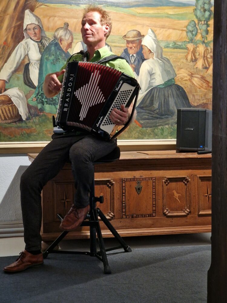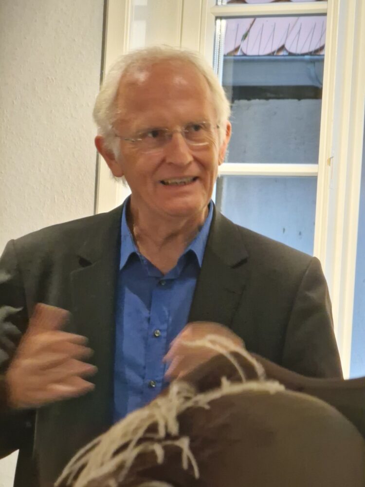 Der Kasseler Musiker Welf Kerner begleitete die Veranstaltung musikalisch und trug Paul Flemings Gedicht „Gedanken über der Zeit“ in einer ausdrucksstarken Interpretation vor, ein Text, der bereits 400 Jahre alt ist. Seine Darbietung schuf eine ruhige, reflektierende Atmosphäre, die sich harmonisch in den thematischen Rahmen der Ausstellung einfügte und die zentrale Auseinandersetzung mit dem Verlauf der Zeit unterstrich.