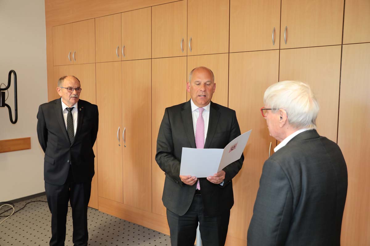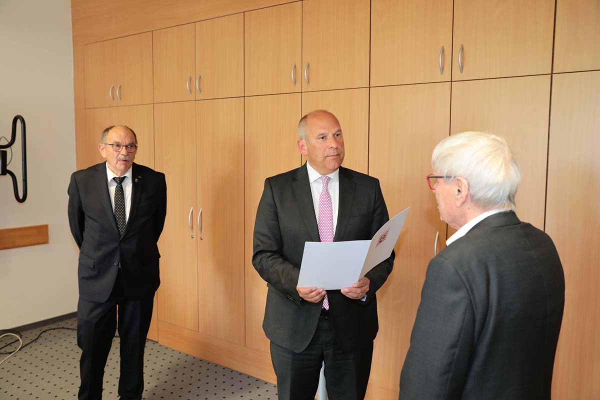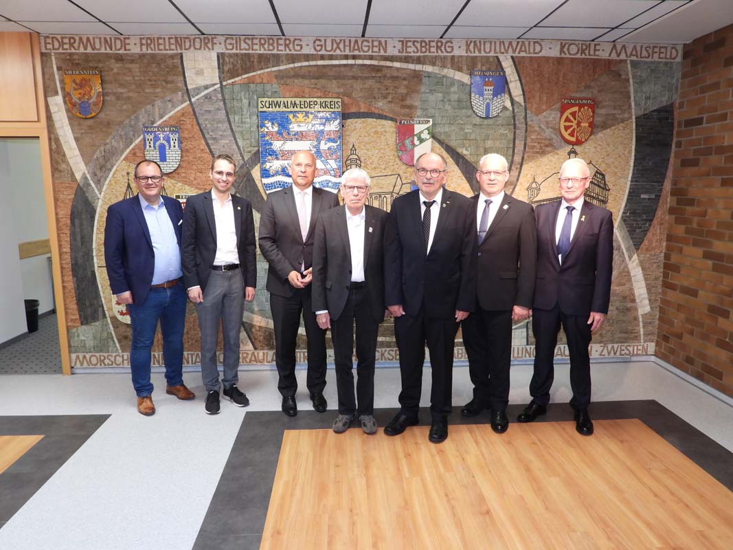 HOMBERG. Der Hessische Innenminister Roman Poseck (CDU) hat am Donnerstag im Homberger Landratsamt Gerd Höfer aus Neukirchen und Horst Nierichlo aus Schwarzenborn (beide SPD) für ihr 50-jähriges ehrenamtliches Engagement mit der Freiherr-vom-Stein-Plakette des Landes Hessen ausgezeichnet.