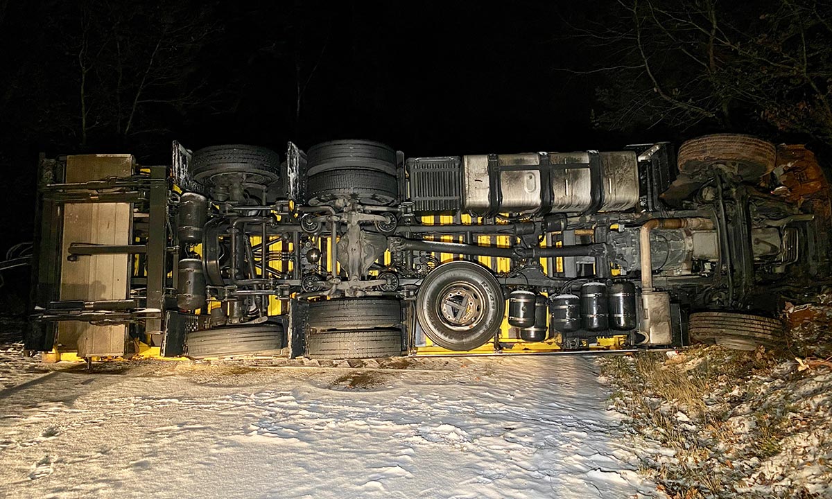 Im Bereich einer Gefällstrecke geriet der Fahrer eines Gliederzuges ins Rutschen. Alle Bemühungen den Lkw auf der Straße zu halten, scheiterten. Quer zur Fahrbahn rutschend, stieß der Lkw zunächst mit einem entgegenkommenden VW zusammen. Kurz darauf kippe die Zugmaschine samt Container auf die Seite und blockierte bis zum Morgen die Kreisstraße. Durch den Unfall wurden beide Fahrzeugführer leicht verletzt und vom Rettungsdienst versorgt.