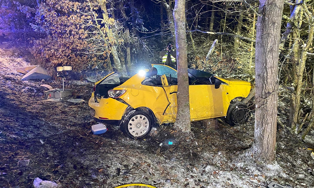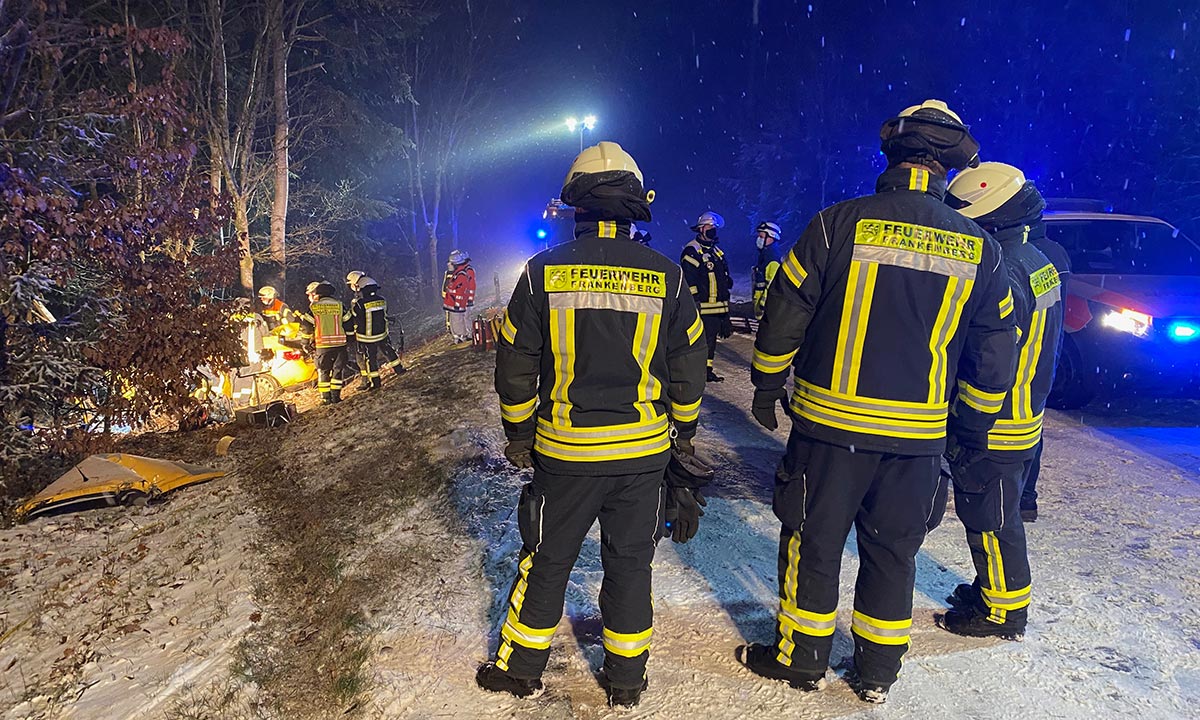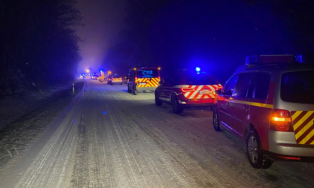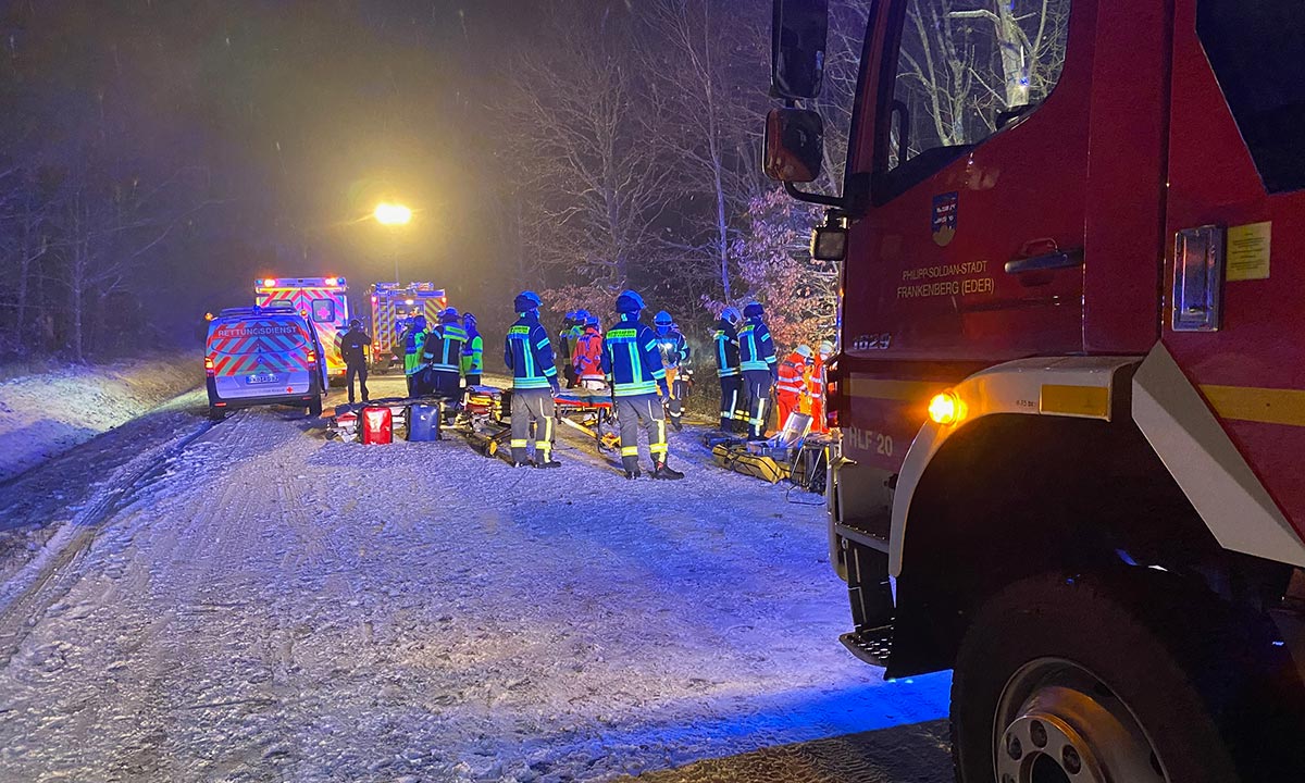 Vier zum Teil schwer verletzte Personen forderte am späten Montagabend ein Verkehrsunfall in dem Waldgebiet zwischen Somplar und Frankenberg. Ein mit vier Personen besetzter Kleinwagen kam auf schneebedeckter und nahezu gerader Strecke nach links von der Fahrbahn ab und krachte mit der Beifahrerseite gegen einen Baum. Durch den heftigen Seitenaufprall wurden nach Angaben der Polizei Frankenberg alle vier Insassen zum Teil schwer verletzt. Zahlreiche Rettungskräfte, auch aus den benachbarten Landkreisen, eilten den Verletzten zur Hilfe. Eine verletzte Person befand sich bei Ankunft der ersten Rettungskräfte bereits außerhalb des Fahrzeuges, drei weitere noch im Fahrzeug. Um die Verletzten versorgen und schonend aus dem Unfallwrack retten zu können, wurde von der Feuerwehr das Fahrzeug zunächst gesichert und das Dach entfernt. Alle Verletzten wurden nach ihrer Erstversorgung in Krankenhäuser nach Marburg, Frankenberg und Korbach transportiert.