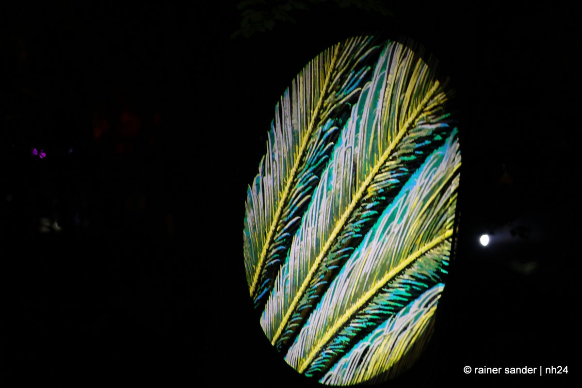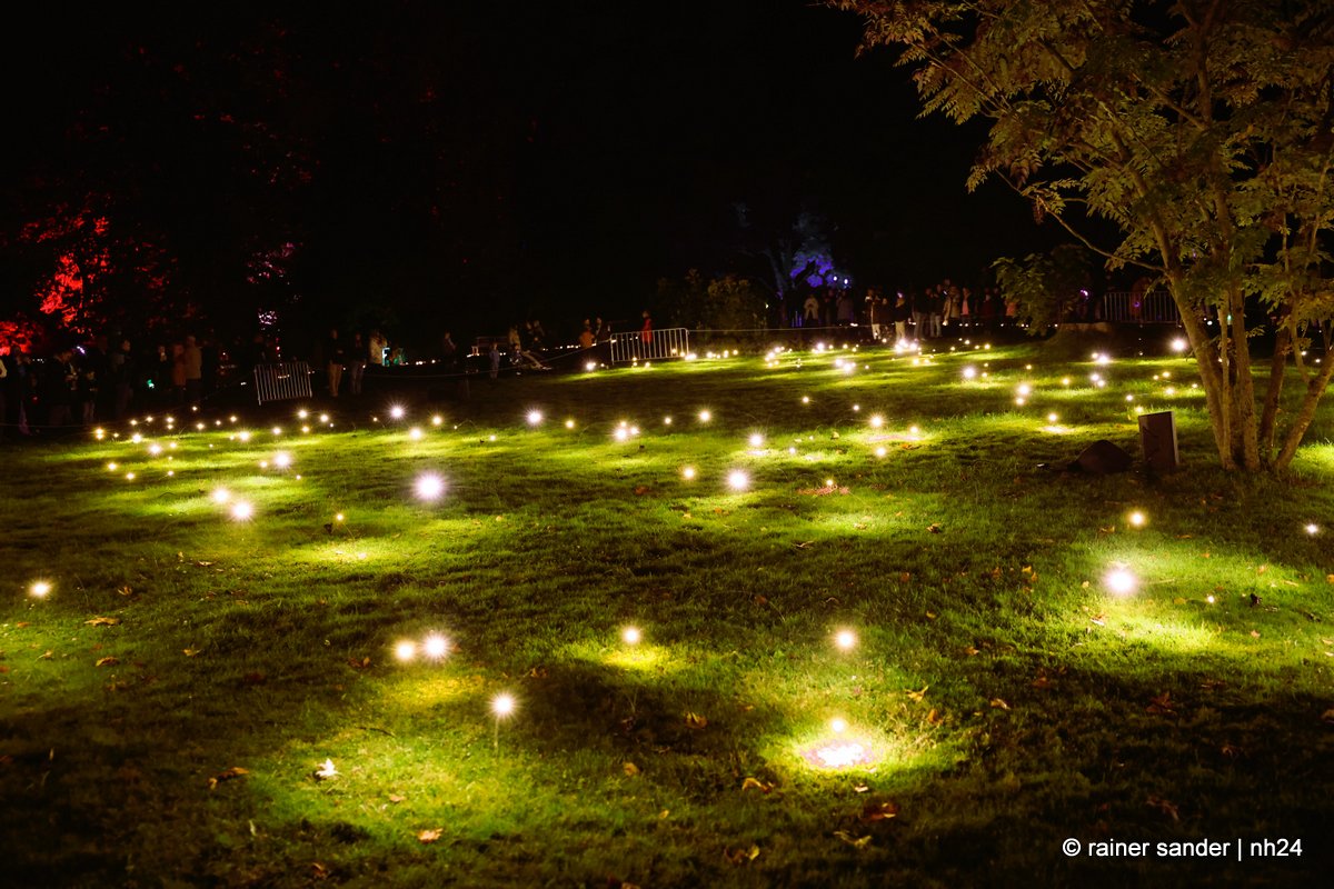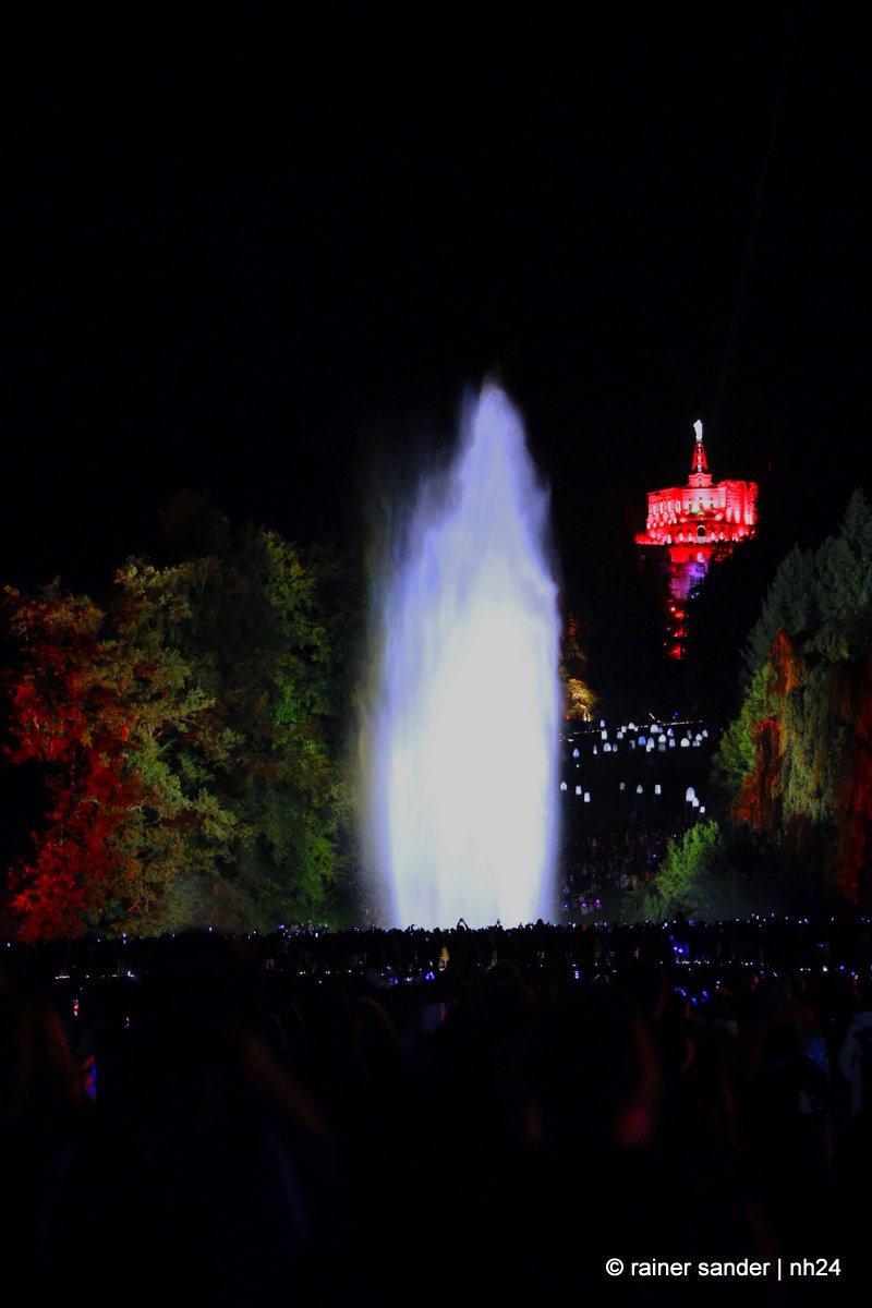 Inspirierend waren auch die anderen Installationen. Das „Tor in eine andere Dimension“ beispielsweise oder der „Wasserweg“, die „Gazeprojektionen“ oder das „Blumenfenster“. Eine Skulptur aus Lichtfäden fiel am Samstagabend dem Klettertrieb eines stürmischen Jungen zum Opfer. Der Donnerstag war von ein paar Pannen begleitet, die im Laufe des Abends behoben wurden. Höhepunkt am Wochenende war schließlich die Neuinszenierung der beleuchteten Wasserspiele mit musikalischer Begleitung.
