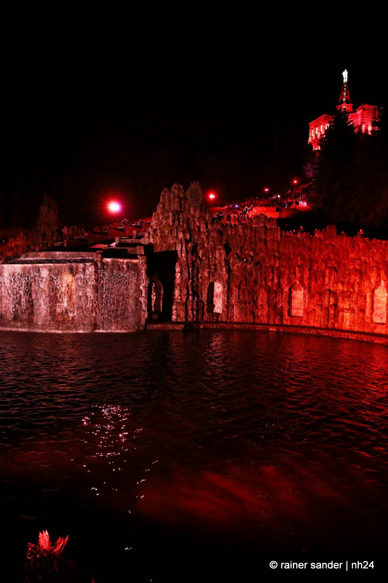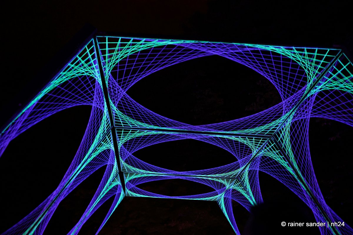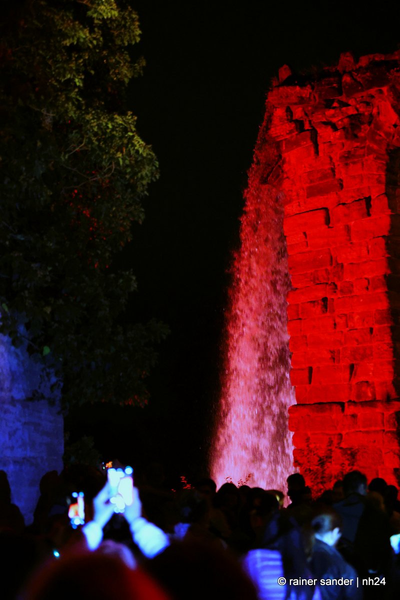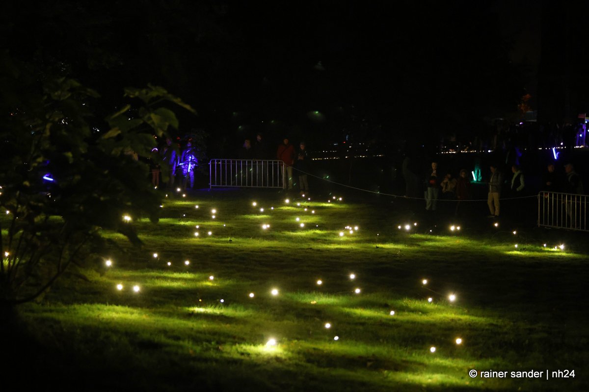 Inspirierend waren auch die anderen Installationen. Das „Tor in eine andere Dimension“ beispielsweise oder der „Wasserweg“, die „Gazeprojektionen“ oder das „Blumenfenster“. Eine Skulptur aus Lichtfäden fiel am Samstagabend dem Klettertrieb eines stürmischen Jungen zum Opfer. Der Donnerstag war von ein paar Pannen begleitet, die im Laufe des Abends behoben wurden. Höhepunkt am Wochenende war schließlich die Neuinszenierung der beleuchteten Wasserspiele mit musikalischer Begleitung.