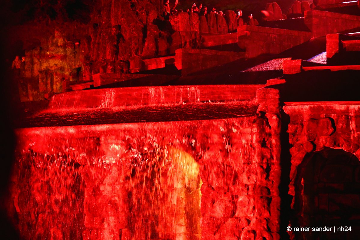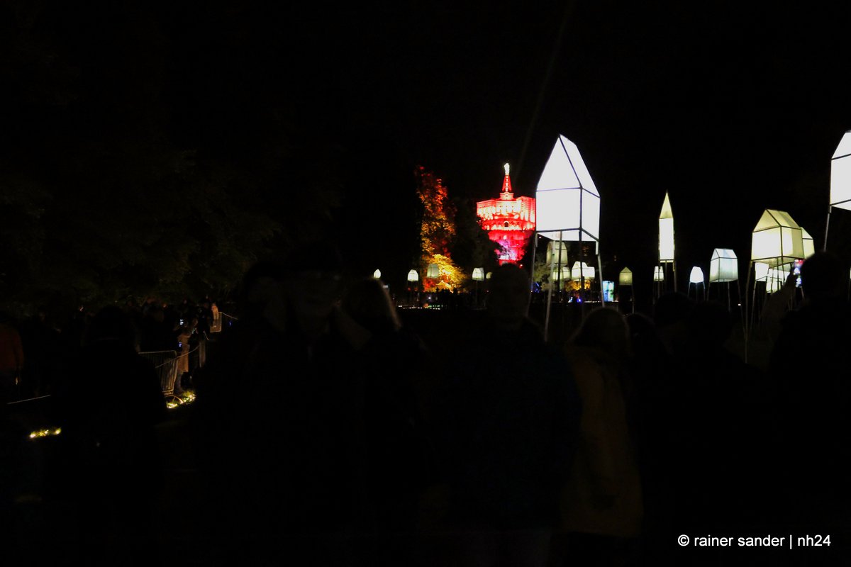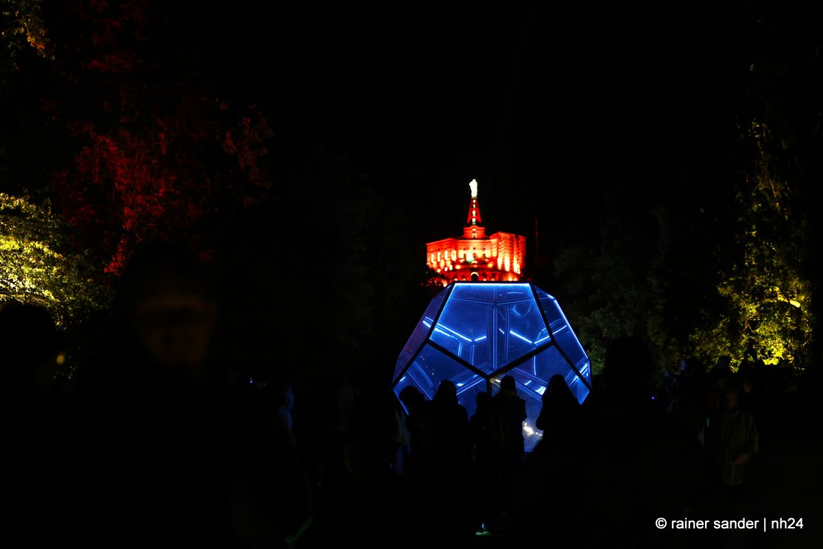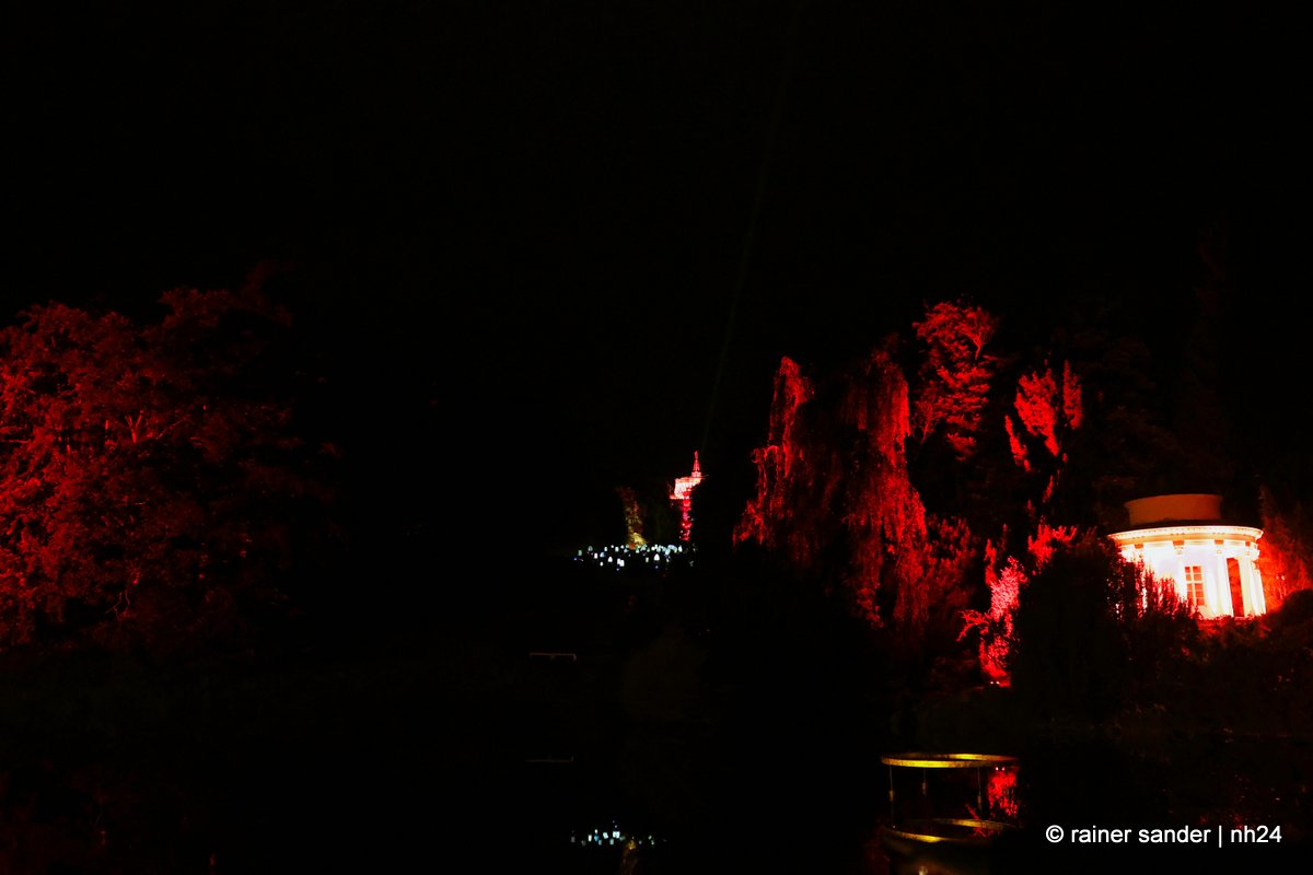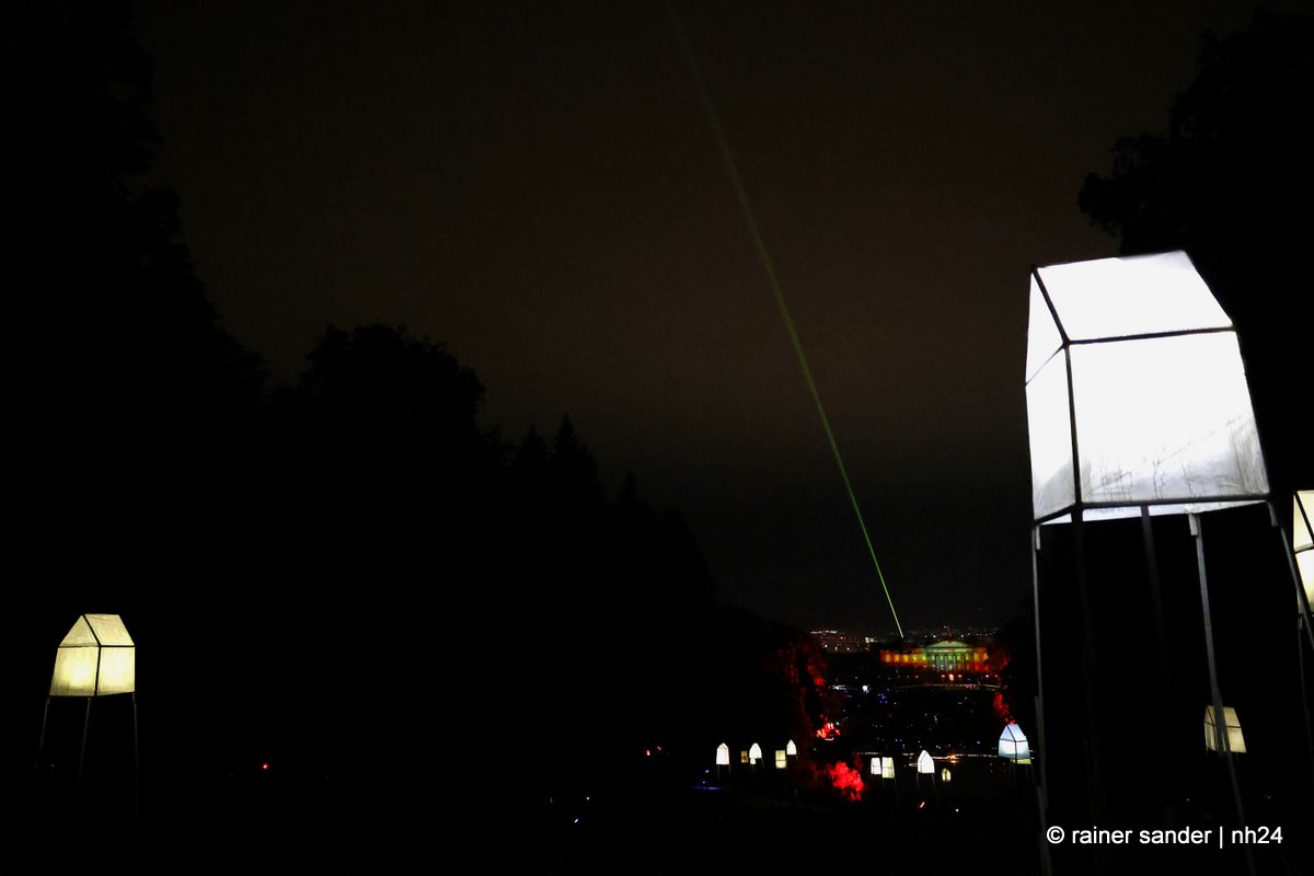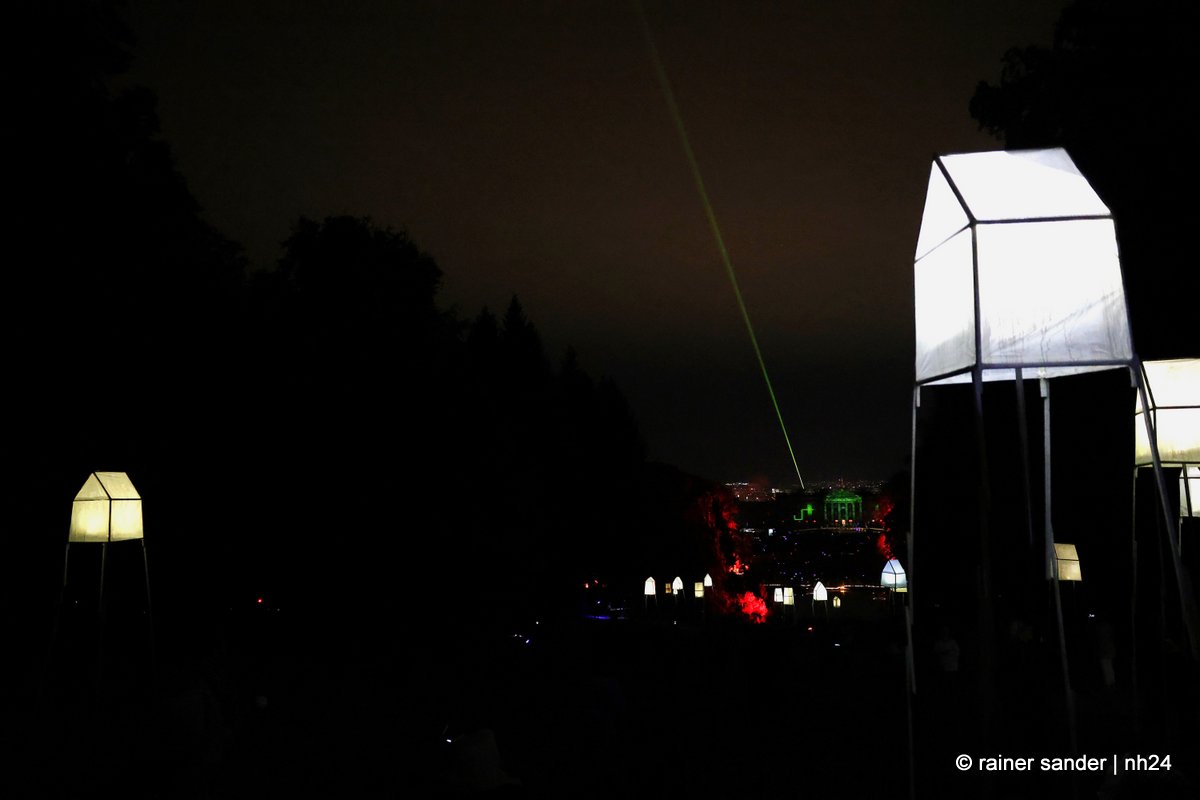 Neun Künstlerinnen und Künstlern beziehungsweise Künstlergruppen aus sechs Ländern hatten jetzt zum zweiten Mal zauberhaft illuminierte Traumlandschaften zwischen Schloss und Kaskaden installiert. Lichtkunstwerke aufgereiht entlang eines beleuchteten Parcours durch den Bergpark. Der Weg am „Pfad der Liebe“ mit rot leuchtenden Herzen führte zum „All Ein“. Alles ist eins, eine Skulptur im Schlossteich. Allein konnte man an den Abenden von Donnerstag bis Sonntag nicht sein. Tausende strömten durch den nächtlichen Park, vorbei an Herbergen, die leuchtend und schwebend ein bisschen an die Hütte von Baba Yaga auf Mussorgskis Bildern einer Ausstellung von EL&P erinnerten.