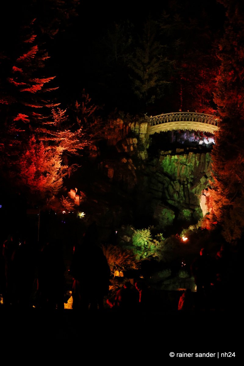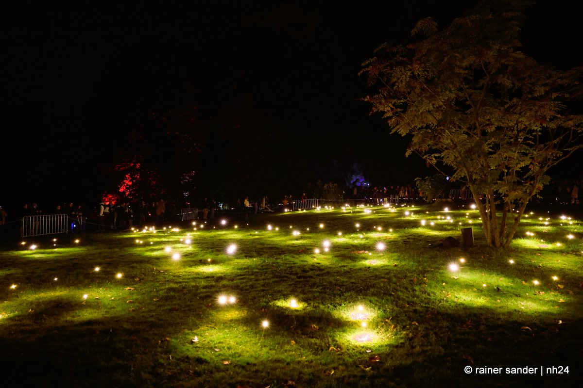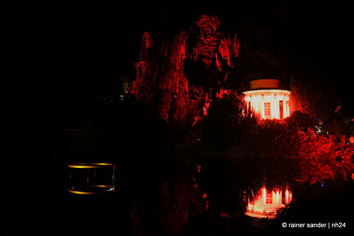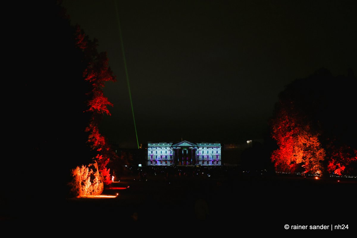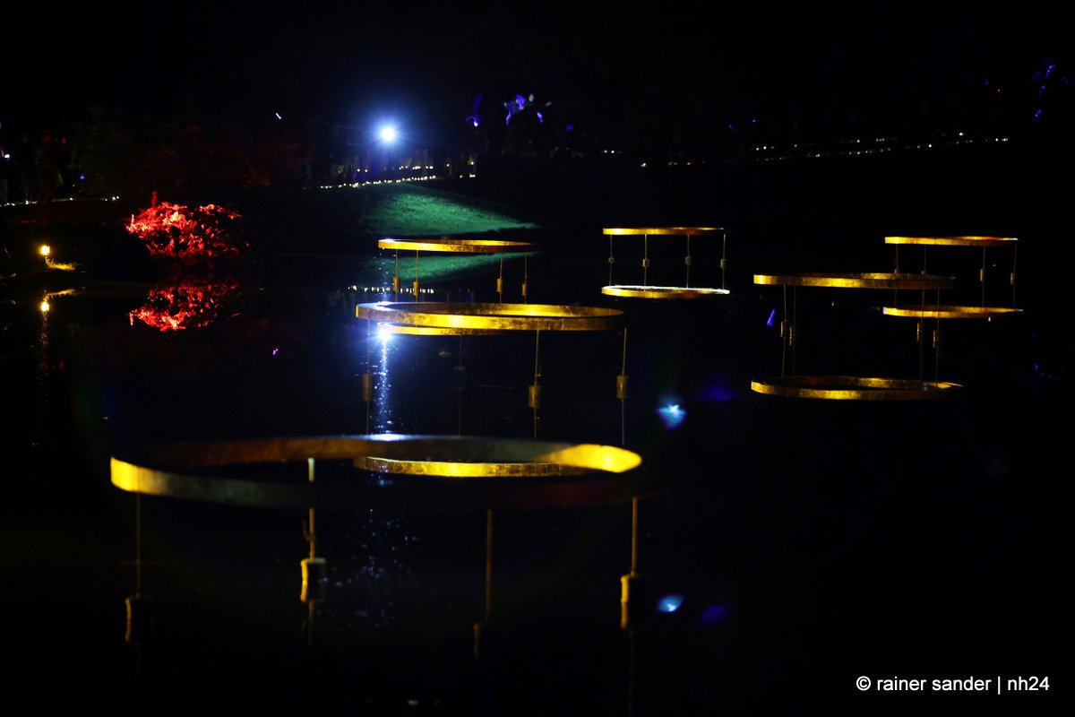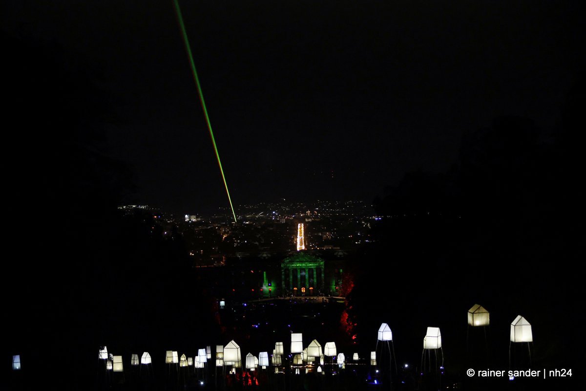 Neun Künstlerinnen und Künstlern beziehungsweise Künstlergruppen aus sechs Ländern hatten jetzt zum zweiten Mal zauberhaft illuminierte Traumlandschaften zwischen Schloss und Kaskaden installiert. Lichtkunstwerke aufgereiht entlang eines beleuchteten Parcours durch den Bergpark. Der Weg am „Pfad der Liebe“ mit rot leuchtenden Herzen führte zum „All Ein“. Alles ist eins, eine Skulptur im Schlossteich. Allein konnte man an den Abenden von Donnerstag bis Sonntag nicht sein. Tausende strömten durch den nächtlichen Park, vorbei an Herbergen, die leuchtend und schwebend ein bisschen an die Hütte von Baba Yaga auf Mussorgskis Bildern einer Ausstellung von EL&P erinnerten.