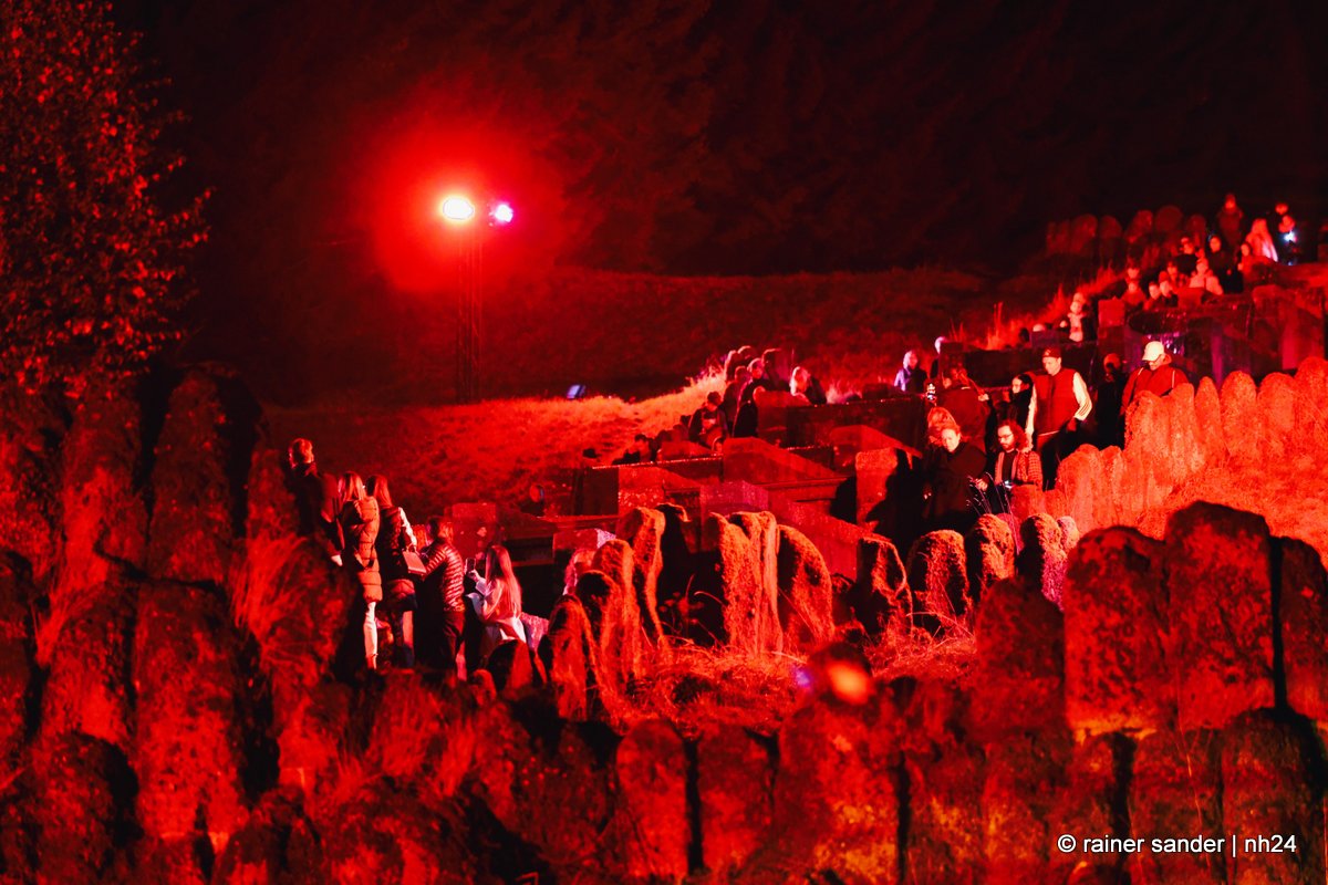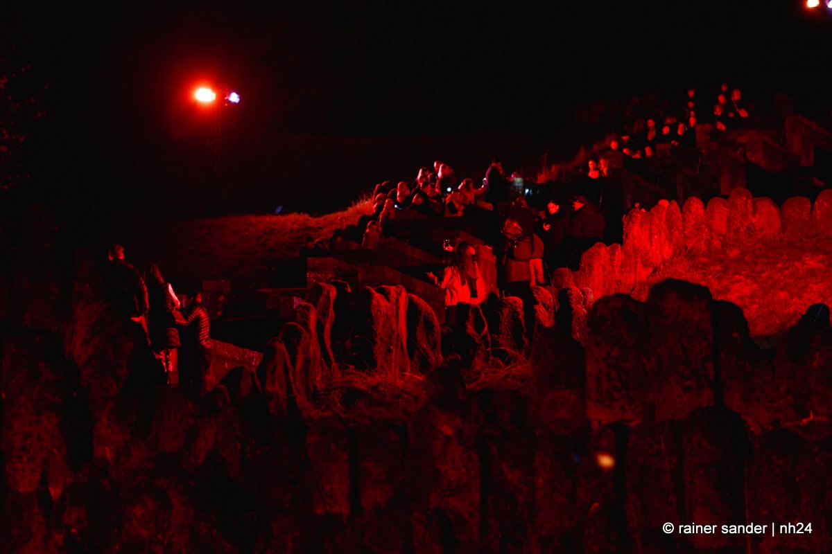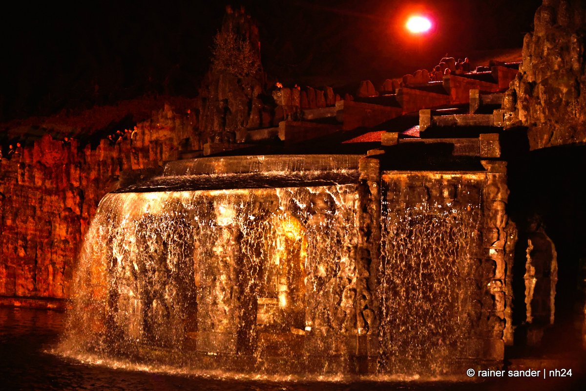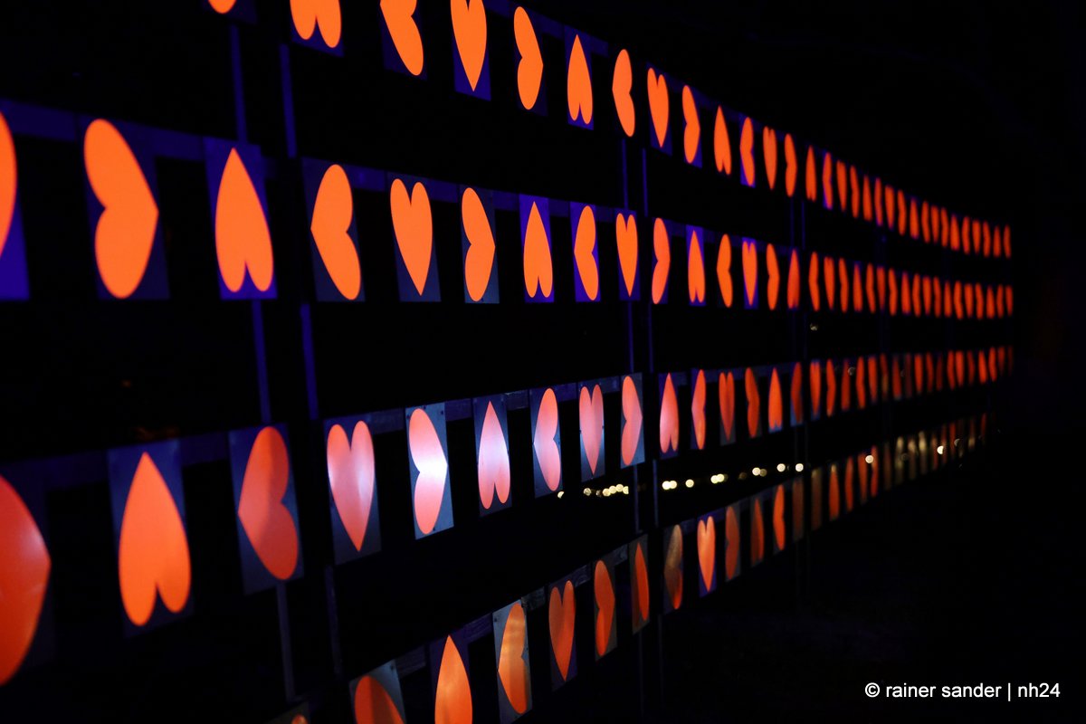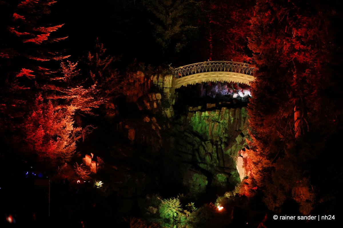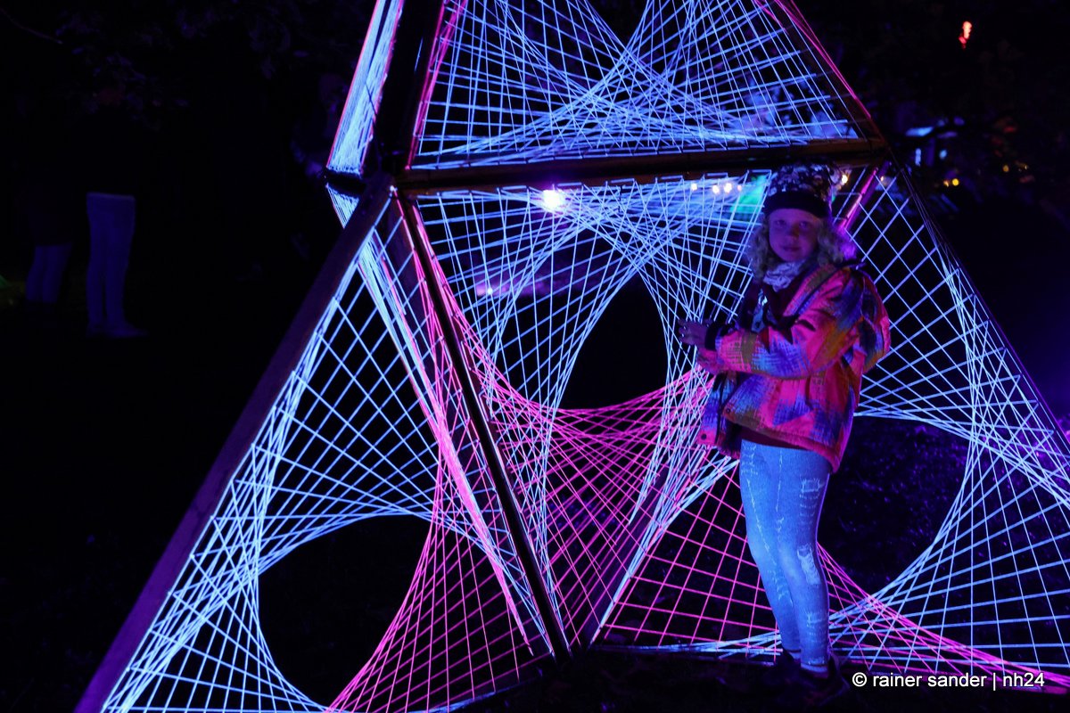 Neun Künstlerinnen und Künstlern beziehungsweise Künstlergruppen aus sechs Ländern hatten jetzt zum zweiten Mal zauberhaft illuminierte Traumlandschaften zwischen Schloss und Kaskaden installiert. Lichtkunstwerke aufgereiht entlang eines beleuchteten Parcours durch den Bergpark. Der Weg am „Pfad der Liebe“ mit rot leuchtenden Herzen führte zum „All Ein“. Alles ist eins, eine Skulptur im Schlossteich. Allein konnte man an den Abenden von Donnerstag bis Sonntag nicht sein. Tausende strömten durch den nächtlichen Park, vorbei an Herbergen, die leuchtend und schwebend ein bisschen an die Hütte von Baba Yaga auf Mussorgskis Bildern einer Ausstellung von EL&P erinnerten.
