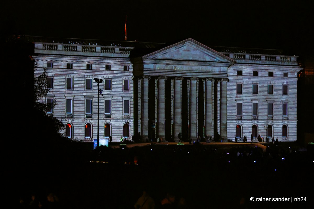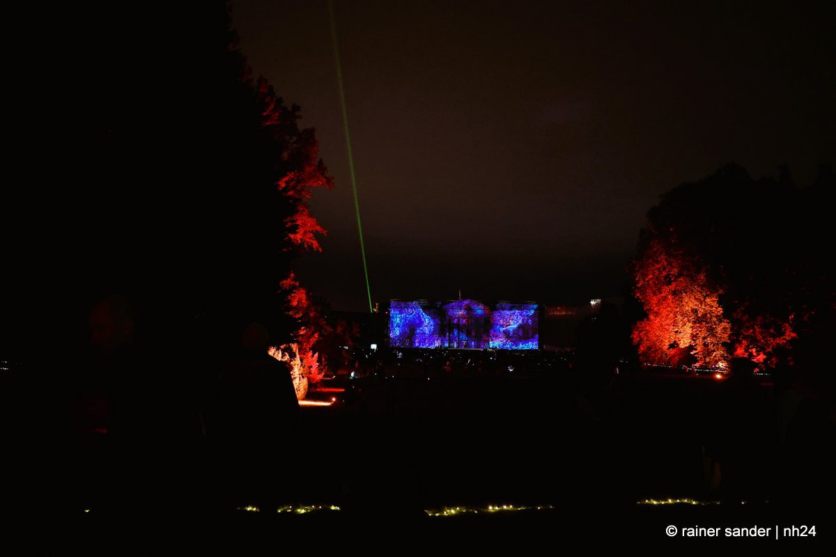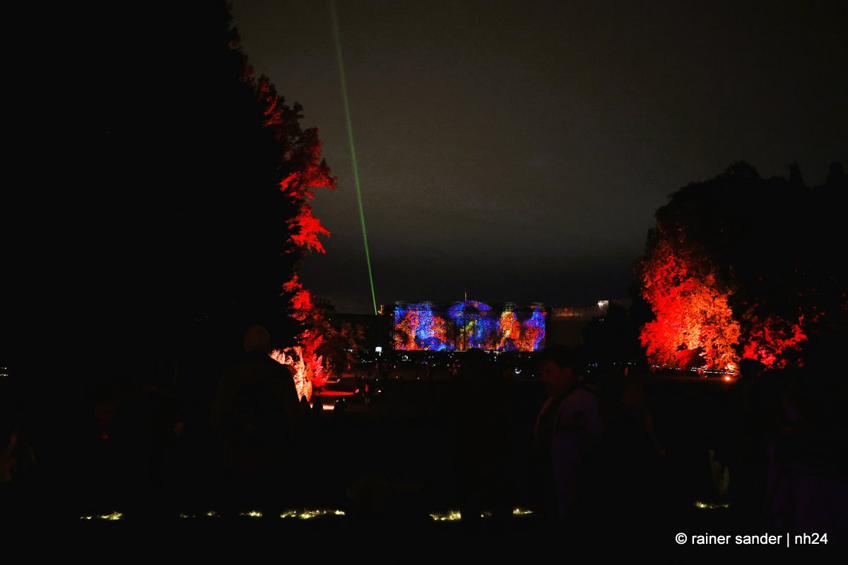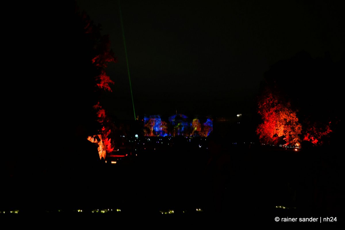 Dieses Jahr vom 3. bis 6. Oktober präsentierte sich das Schloss Wilhelmshöhe spektakulär mit Formen, Bildern und Farben aus Videoprojektionen angestrahlt. Auf der Wiese davor tanzten weiße Lichter und verwandelten die Rasenfläche in eine überdimensionale „Glühwürmchen-Wiese“. Gegenüber am Herkules bewegten sich Lichtprojektionen am Himmel und auf der Fassade rund um den Zwei-Farben-Laser am Samstagabend. Die „Laserscape Kassel“ von Horst H. Baumann – installiert zur documenta 6 – passt wunderbar in die modernen Lichtkunstwerke. Schon im Jahr 1977 gab es Light-Art an der Fulda.