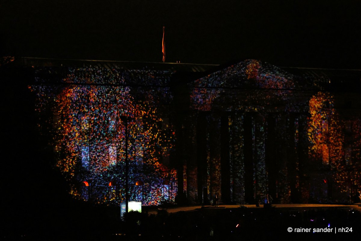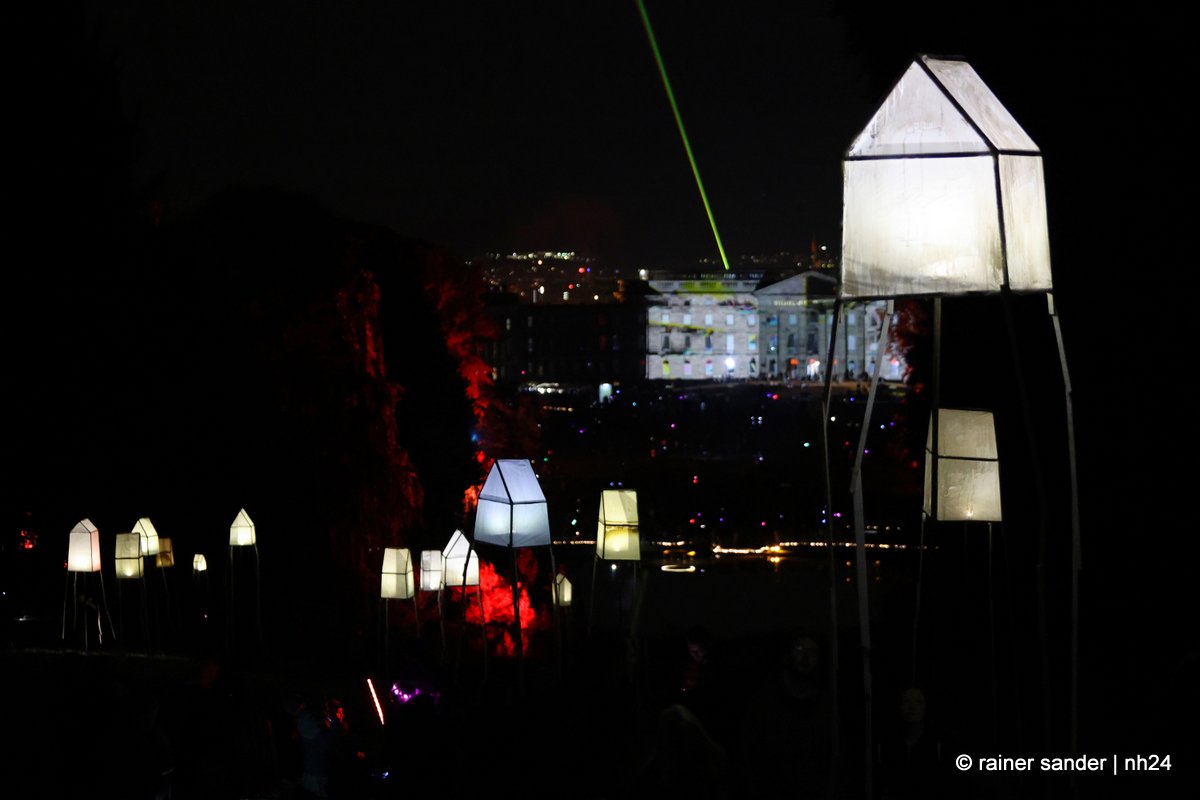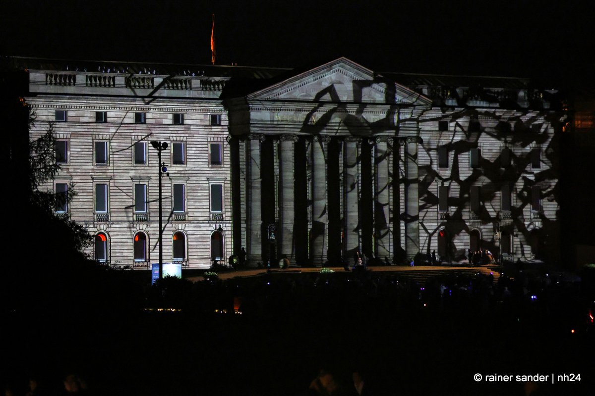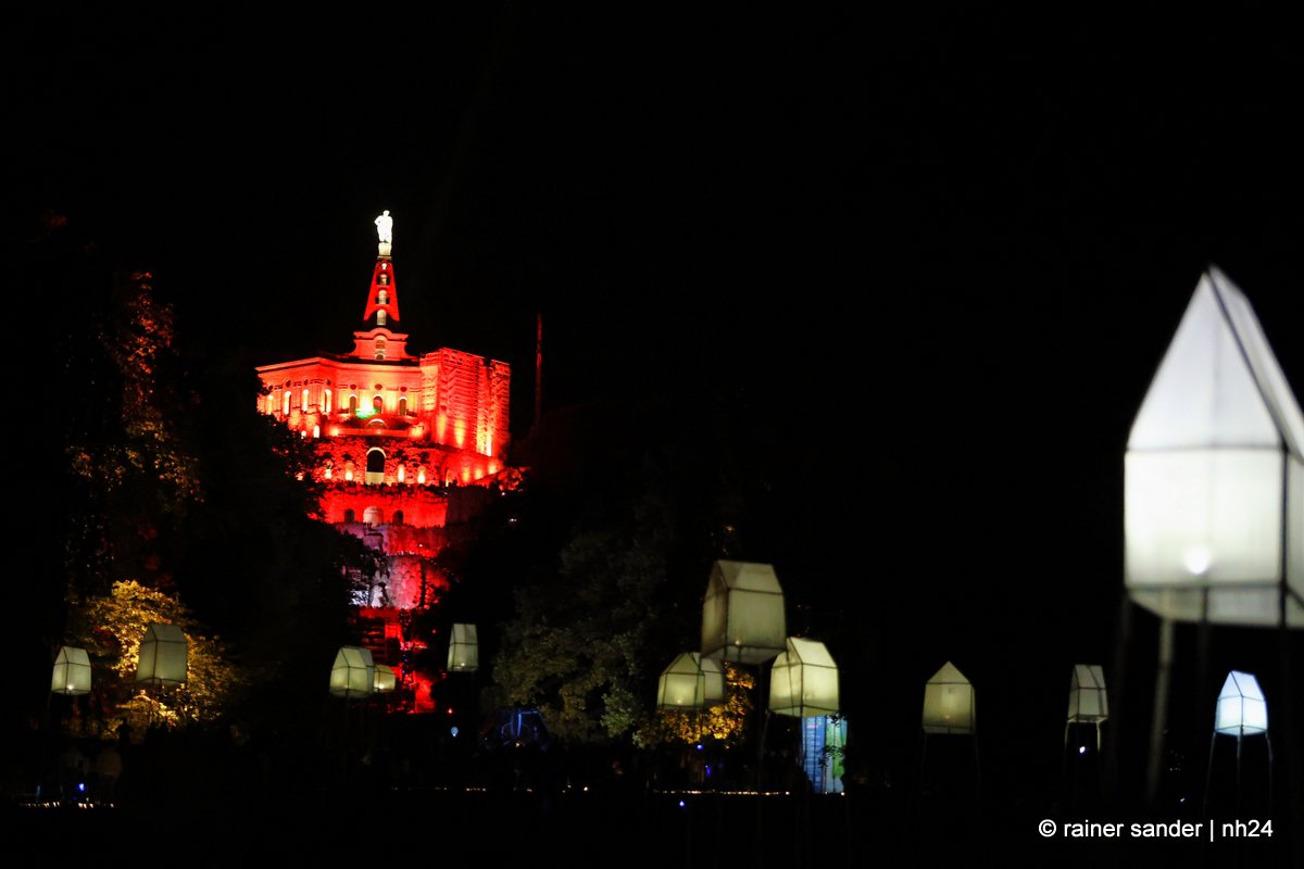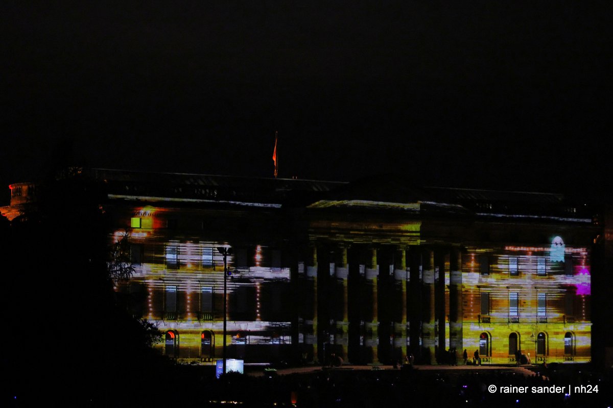 Dieses Jahr vom 3. bis 6. Oktober präsentierte sich das Schloss Wilhelmshöhe spektakulär mit Formen, Bildern und Farben aus Videoprojektionen angestrahlt. Auf der Wiese davor tanzten weiße Lichter und verwandelten die Rasenfläche in eine überdimensionale „Glühwürmchen-Wiese“. Gegenüber am Herkules bewegten sich Lichtprojektionen am Himmel und auf der Fassade rund um den Zwei-Farben-Laser am Samstagabend. Die „Laserscape Kassel“ von Horst H. Baumann – installiert zur documenta 6 – passt wunderbar in die modernen Lichtkunstwerke. Schon im Jahr 1977 gab es Light-Art an der Fulda.