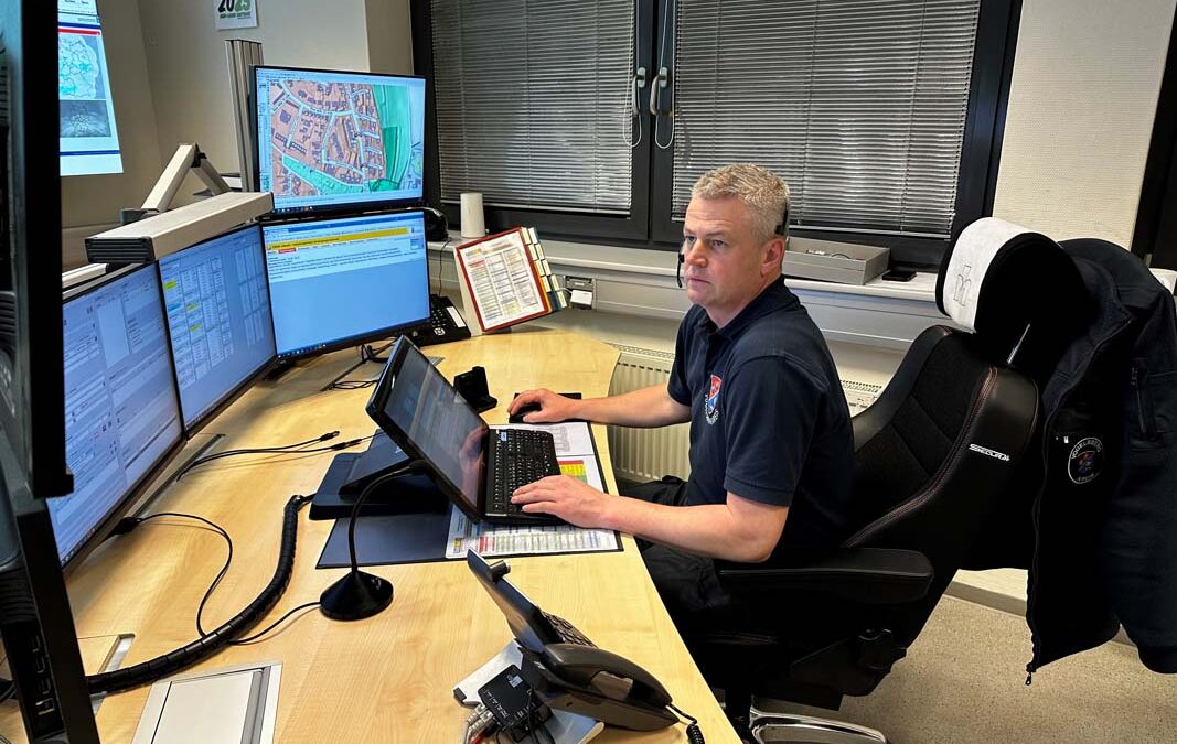 „Hat er Druck auf der Brust? Bekommt er Luft?“ – mit ruhiger Stimme stellt Philipp Adamietz gezielte Fragen, während er die Anruferin beruhigt. Auf seinem Bildschirm sieht er die Anfahrtszeit: „In zweieinhalb Minuten sind Rettungswagen und Notarzt vor Ort.“ Währenddessen organisierte sein Kollege Jan Schmolk einen Krankentransport für eine ältere Dame. Der nächste Notruf folgt sofort – erneut Brustschmerzen. „Unsere erste Frage ist immer nach dem Ort des Notfalls“, erklärt Kreisbrandinspektor Marcell Büttner. „Sollte die Verbindung abbrechen, wissen wir zumindest, wohin wir die Einsatzkräfte schicken müssen.“