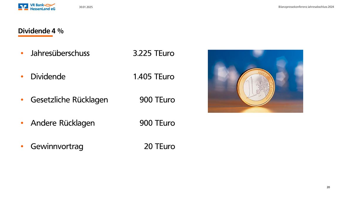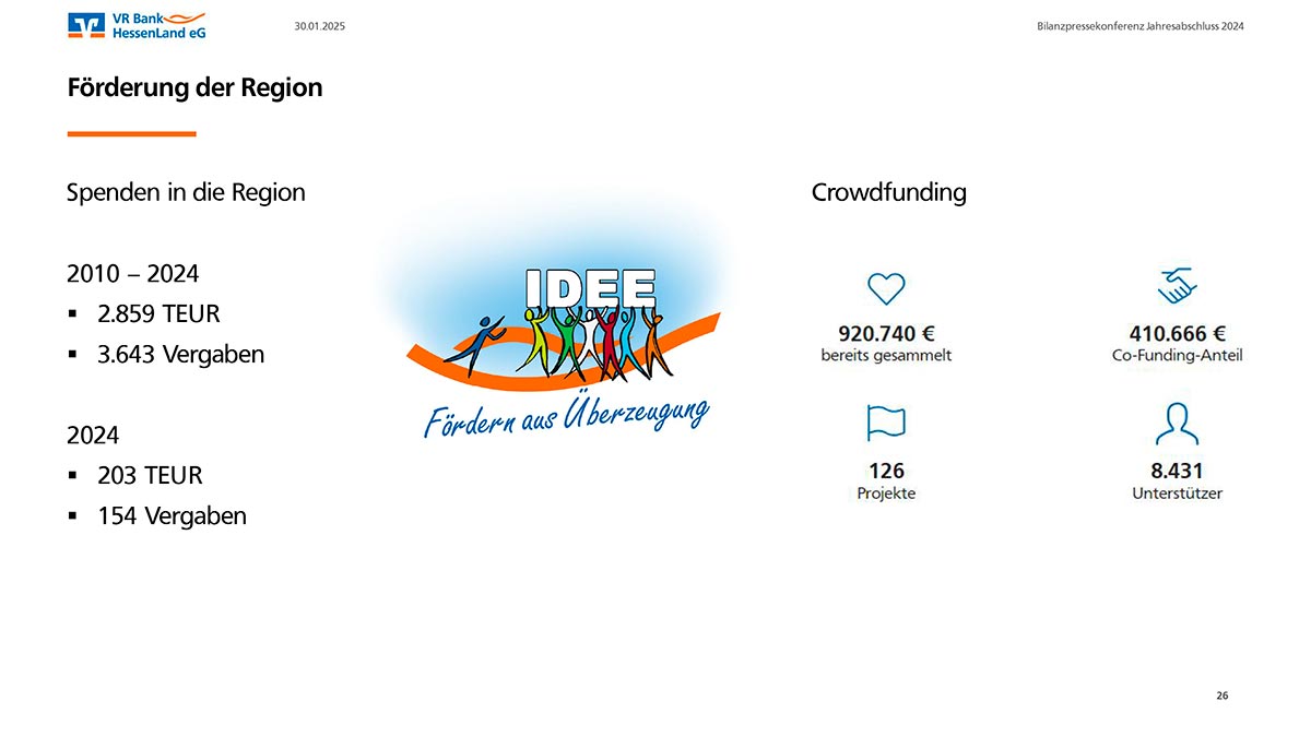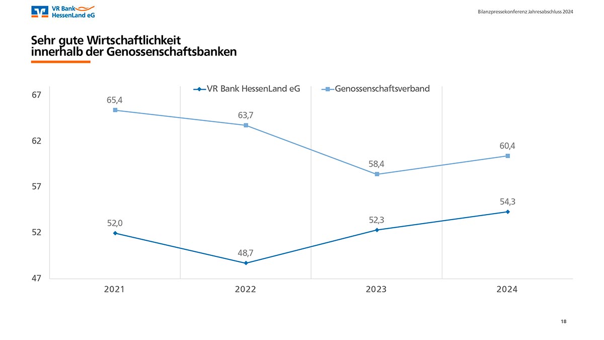 Insgesamt erzielte die VR Bank ein Betriebsergebnis von 22,3 Mio. Euro. Die gestiegene Eigenkapitalquote lag im Jahr 2024 bei 18,9 Prozent. Seit Jahren arbeitet die Bank sehr wirtschaftlich und hat eine überdurchschnittliche Aufwands-Ertragsrelation von 54,3 % (um einen Euro zu erwirtschaften, wurden 54,3 Cent investiert).