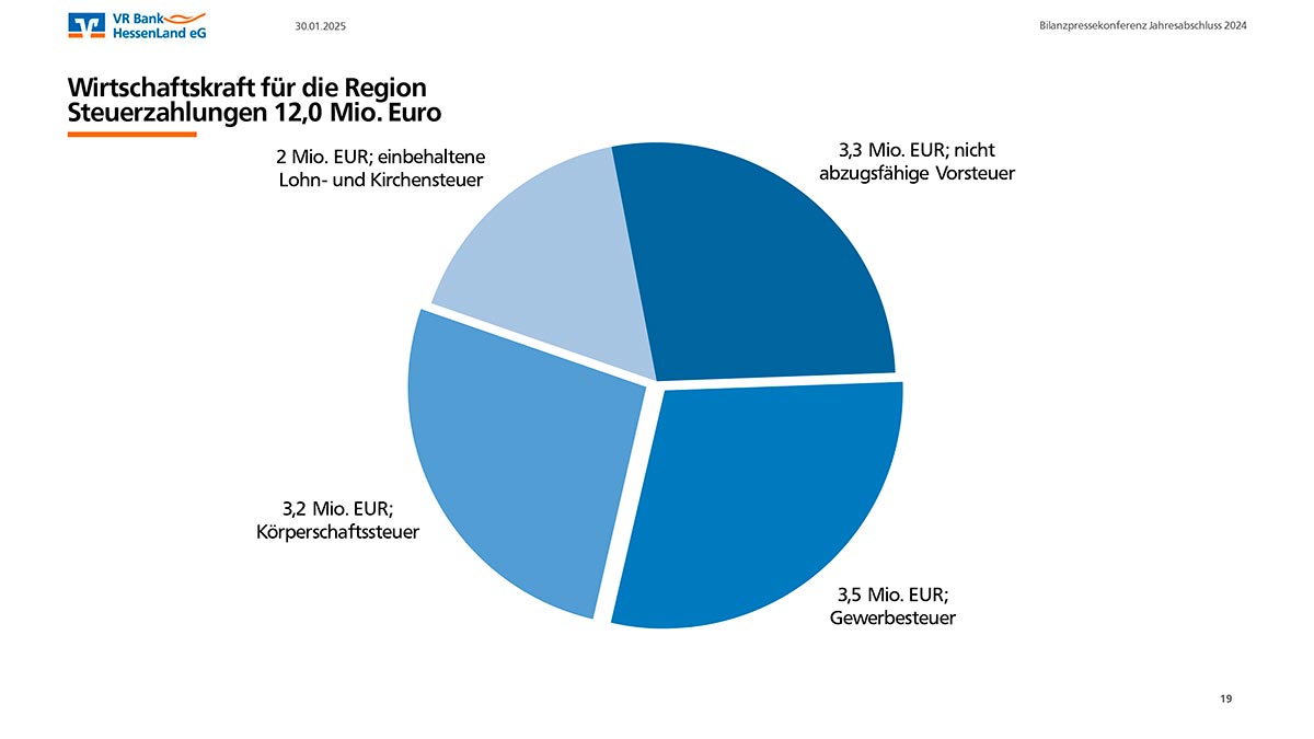 Der Steueraufwand der VR Bank beträgt 6,7 Mio. Euro, davon fließen 3,5 Mio. Euro als Gewerbesteuer an die Kommunen. Die 40.631 Mitglieder erhalten eine unveränderte Dividende von vier Prozent. (wal)