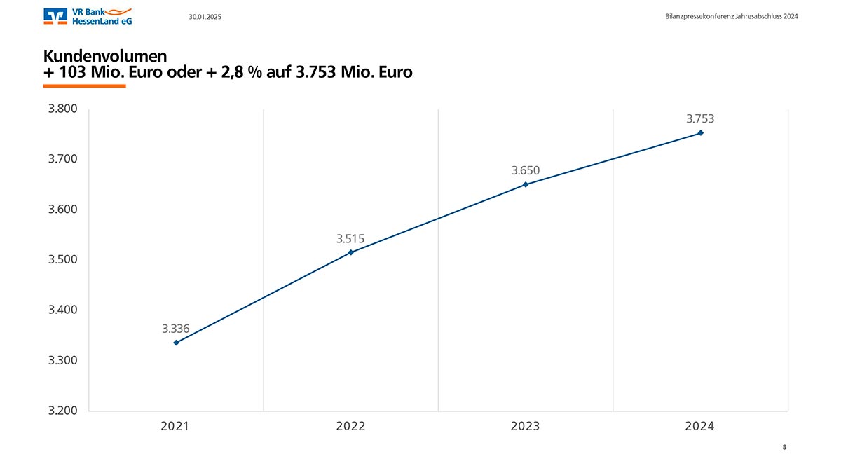 Das betreute Kundenvolumen stieg um 103 Mio. Euro auf 3,8 Mrd. Euro. Haupttreiber waren Kundeneinlagen, die um 50 Mio. Euro (+3,7 %) zunahmen. Wertpapieranlagen im Depot der Bank wuchsen um 71 Mio. Euro (+8,1 %). Zudem gewann die Bank 1.611 Neukunden in diesem Bereich. Das Bauspargeschäft erreichte mit 54 Mio. Euro ein neues Rekordniveau.