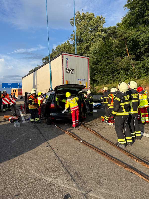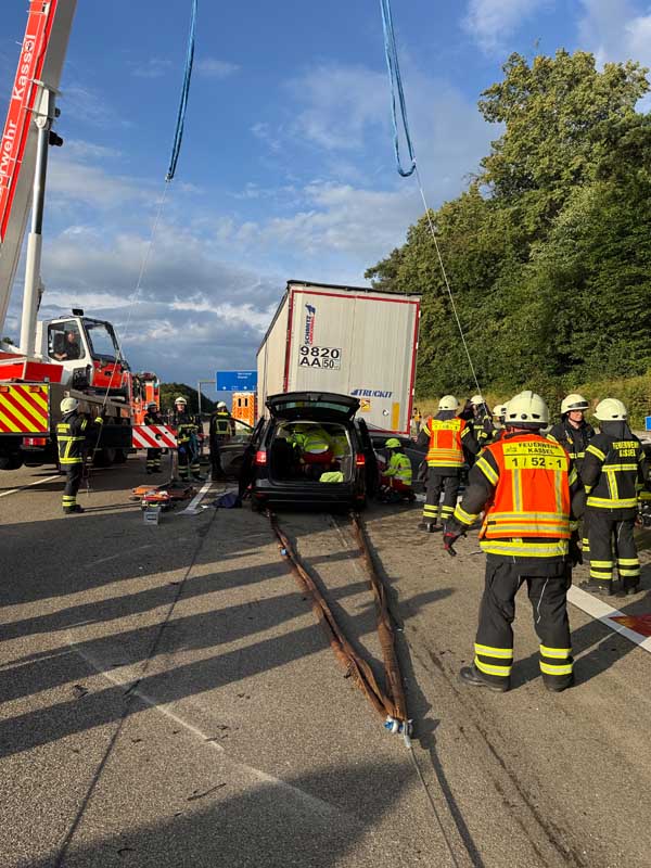 Wie Boris Kempiak von der Berufsfeuerwehr Kassel berichtete, musste der Auflieger zunächst mithilfe eines Feuerwehrkrans angehoben werden, um Zugang zum Fahrzeug zu erhalten. Anschließend wurde der VW mit der maschinellen Zugeinrichtung eines Rüstwagens unter dem Sattelauflieger hervorgezogen. Erst danach konnte die technische Rettung der Insassen mit hydraulischem Rettungsgerät erfolgen. Unter der Leitung von Einsatzleiter Jens Brachmann waren rund 40 Einsatzkräfte im Einsatz, darunter mehrere Notärzte, Rettungsteams sowie Beamte der Polizeiautobahnstation Baunatal.