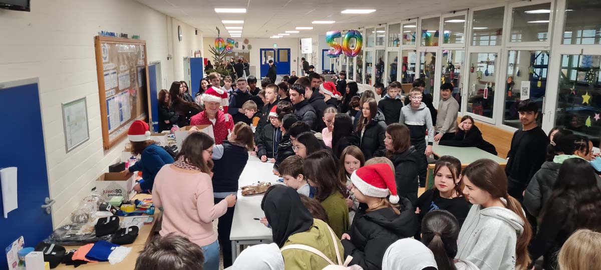 In den ersten beiden Stunden wurde das Erdgeschoss zum Weihnachtsmarkt umgebaut. Waffeln, Kuchen und Punsch wurden verkauft, und viele Projektgruppen stellten ihre Werkstücke aus.
