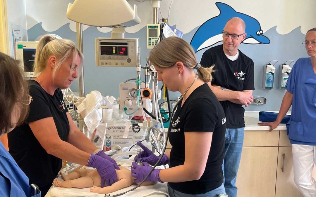Unter der Leitung von Dr. Timm Freudenberg, Oberarzt für Kinderanästhesie, trainierten Ärztinnen und Ärzte, Hebammen und Pflegekräfte gemeinsam mit dem Kinder-Notfall-Trainingsteam (KiNT) verschiedene Szenarien aus dem Bereich der Neugeborenenversorgung. In Kleingruppen wurden unter anderem atemunterstützende Maßnahmen, die Etablierung von Venenzugängen und alternative Zugangswege sowie die Gabe von Notfallmedikamenten nach aktuellem wissenschaftlichem Stand intensiv geübt.