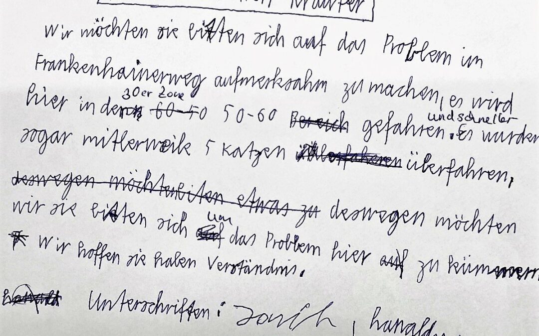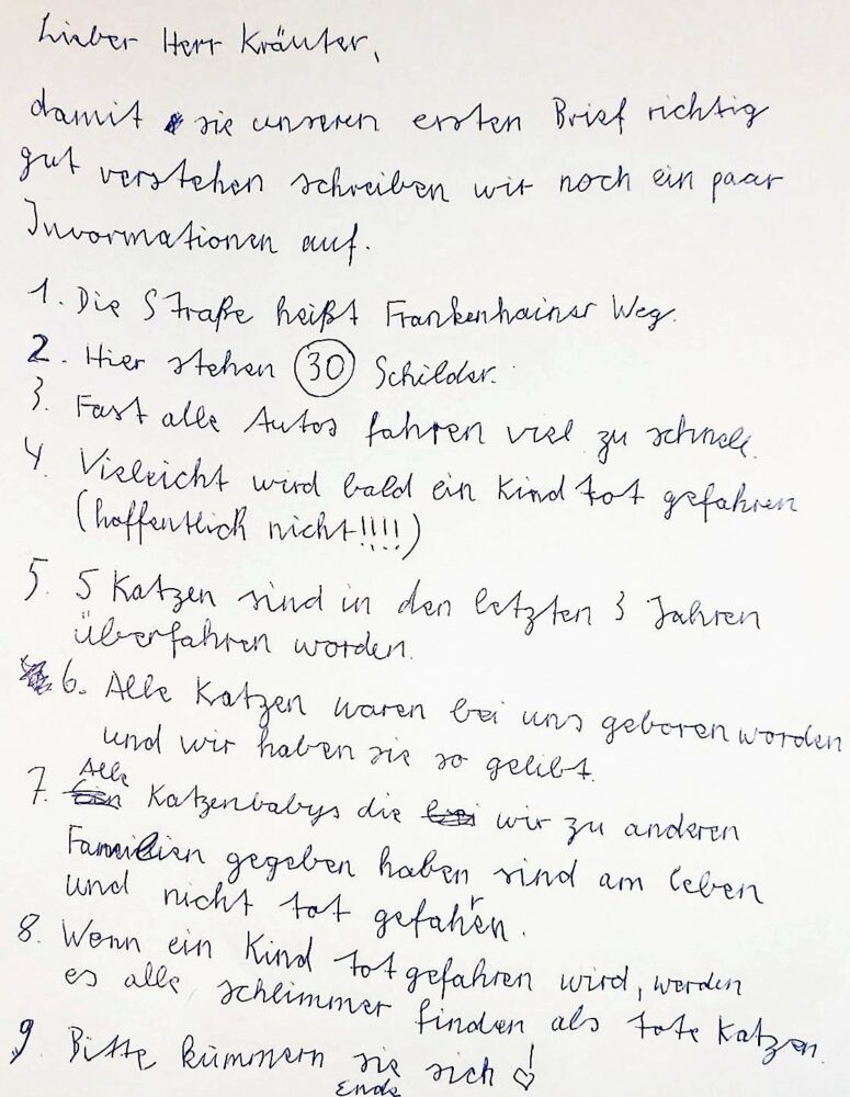 Einen Tag später fanden die Schüler, dass sie das besser erklären müssen und haben noch einmal ausführlich geschrieben. Es handele sich um den Frankenhainer Weg. Die fünf Katzen wurden alle bei ihnen geboren. Jetzt sind sie tot, während die Katzenbabys, die zu anderen Familien gekommen sind, alle noch leben … Sie denken an sich und ihre Freunde: „Wenn ein Kind totgefahren wird, werden es alle schlimmer finden als tote Katzen … Bitte kümmern Sie sich!“