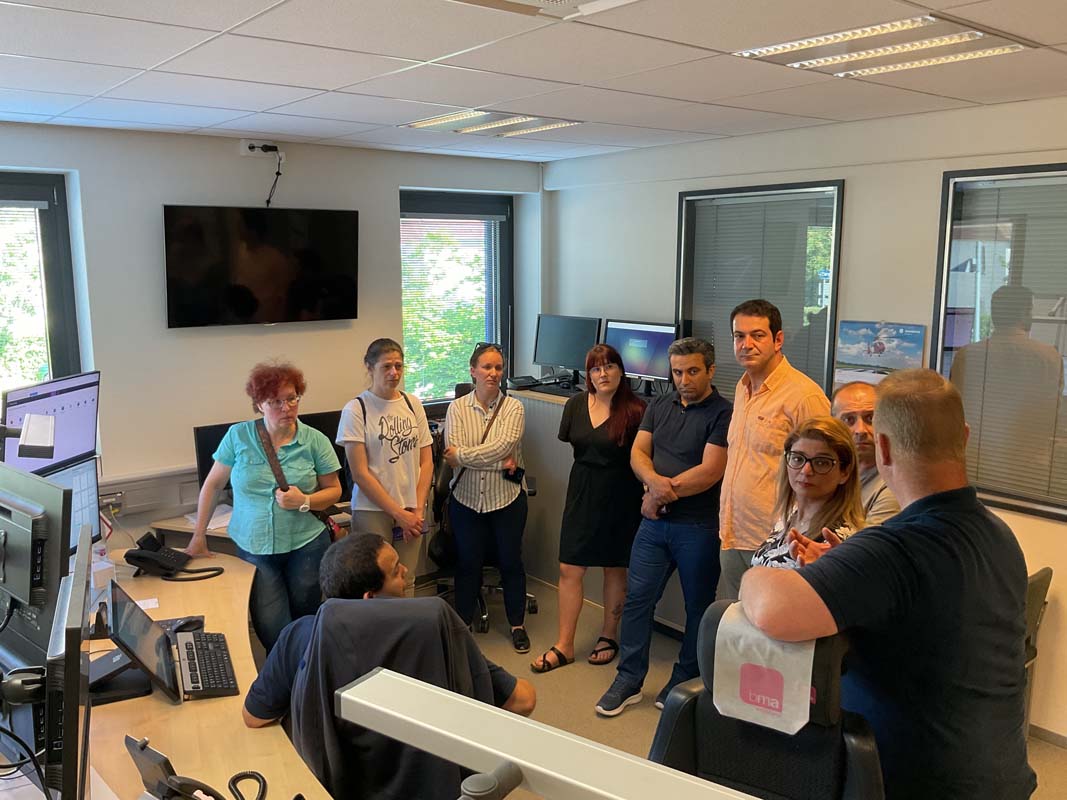 Natürlich ging es auch in die Praxis. Verschiedene Situationen wurden durchgespielt – vom Herzinfarkt bis zur Brandverletzung. Preuß von Brincken schlüpfte in die Rolle des Arztes, der über die Leitstelle telefonisch mit einem Dolmetscher verbunden wurde. „Die Fragen werden direkt gestellt, die Kommunikation läuft im Dreieck. Das hat bei den Übungen sehr gut geklappt“, resümiert Björn Preuß von Brincken. Die Gruppe besuchte auch die Leitstelle und übte dort an der Telefonanlage das Vorgehen bei typischen Unfallsituationen wie dem eingangs geschilderten Treppensturz. Und schließlich inspizierten die Notfalldolmetscher auch die Einsatzfahrzeuge, um zu wissen, mit welchen Geräten und Medikamenten so ein Wagen ausgestattet ist.