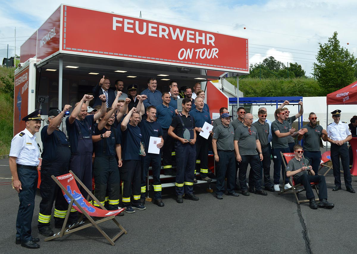 Regierungspräsident Mark Weinmeister, Landrat Bernd Woide und der Vorsitzende des Bezirksfeuerwehrverbands, Gerhard Biederbick, zeigten sich bei der Siegerehrung zufrieden über die gute und kameradschaftliche Stimmung. Weinmeister lobte den Kampfgeist und die Professionalität aller teilnehmenden Mannschaften und dankte den Feuerwehrleuten für ihr ehrenamtliches Engagement.