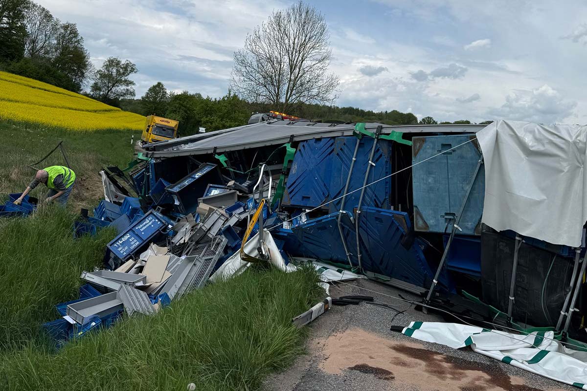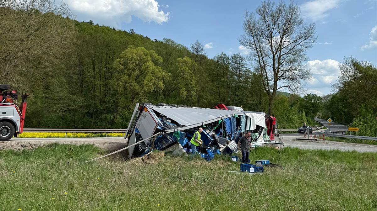SONTRA. Am Freitagmittag kam es auf der Bundesstraße 400 zwischen Wichmannshausen und Krauthausen zu einem Verkehrsunfall, bei dem ein mit Bau- und Wertstoffteilen beladener Sattelzug von der Fahrbahn abkam und umkippte. Der 35-jährige Fahrer aus Russland wurde dabei leicht verletzt.