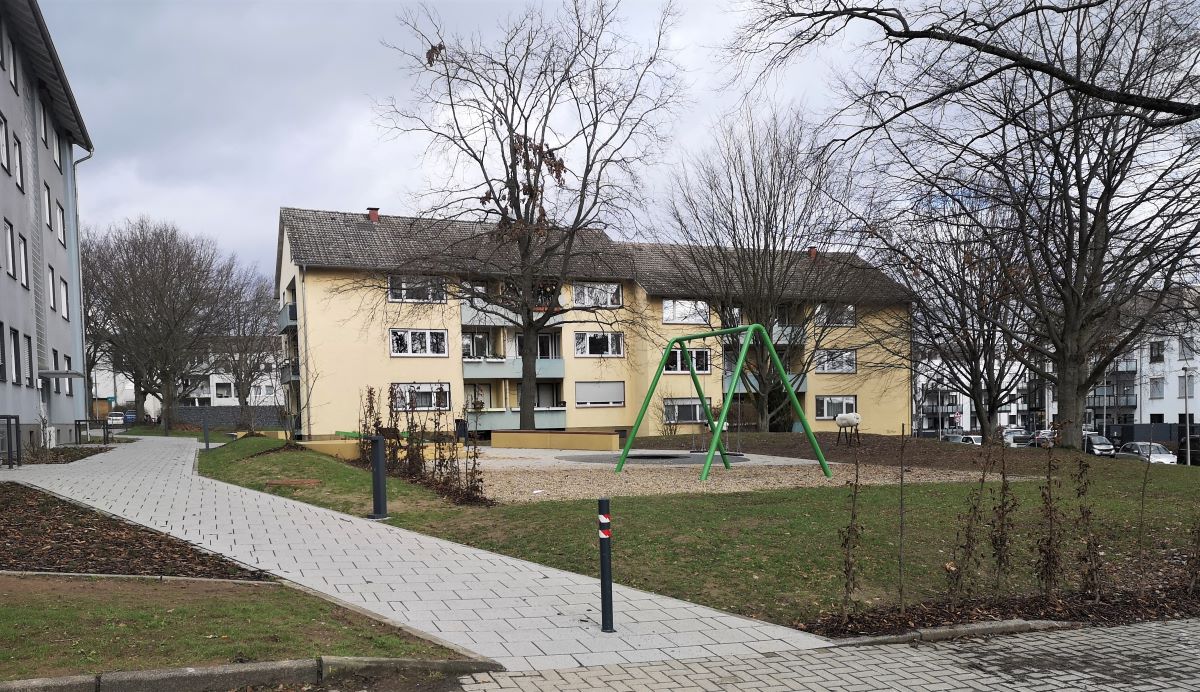 Bänke und Sitzmauern laden an verschiedenen Stellen zum Verweilen ein und bieten die Möglichkeit zum Ausruhen auf längeren Wegen durch das Wohngebiet. Wie schon bei den anderen Wohnumfeldmaßnahmen regen verschiedene Spielgeräte wie ein kleines Bodentrampolin, eine Balancierstrecke oder eine Doppelschaukel Kinder zur Bewegung an und werten die „alten“ Sandspielflächen vor den Häusern erheblich auf. Die Maßnahme wurde gefördert im Rahmen des Förderprogramms Sozialer Zusammenhalt (vorher Soziale Stadt).
