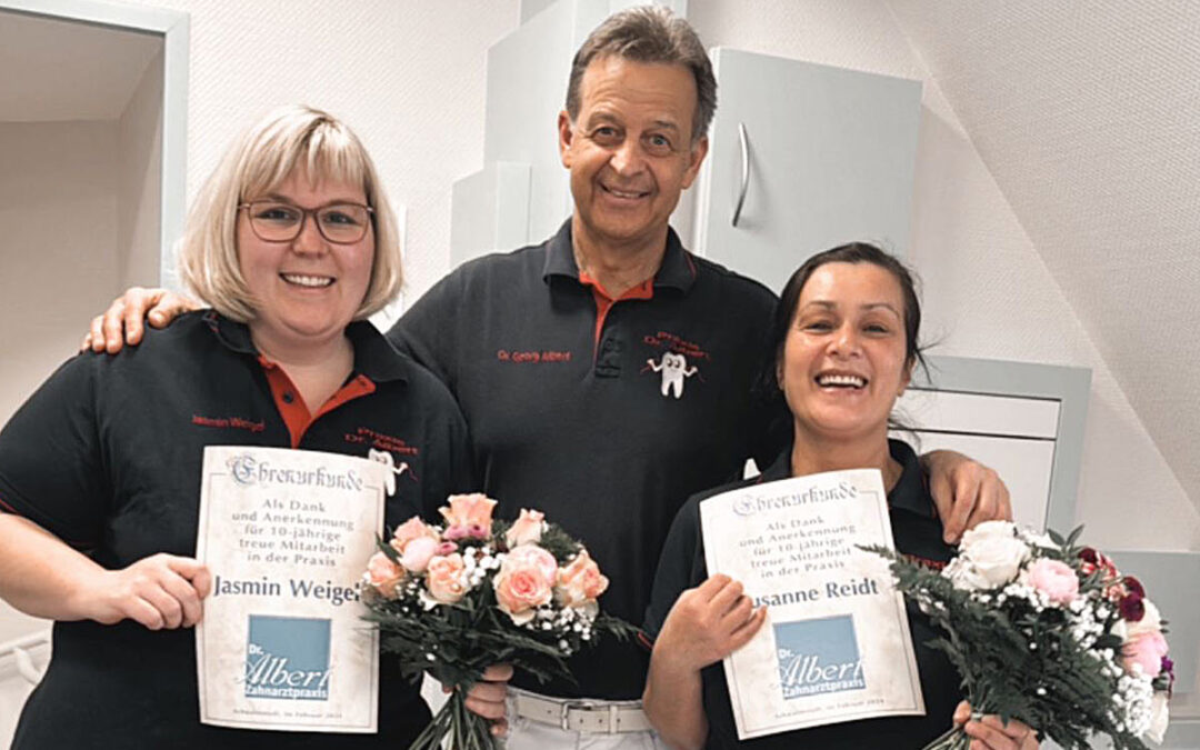 Dr. Albert betonte in seiner Ansprache die Bedeutung von Zuverlässigkeit, Fachkompetenz und Herzlichkeit, die Weigel und Reidt täglich in die Praxis einbringen. Zum Dank für ihre langjährige Loyalität und hervorragende Arbeit überreichte er den beiden Mitarbeiterinnen je eine Urkunde und ein kleines Präsent. Das Team der Zahnarztpraxis Dr. Albert freut sich auf viele weitere Jahre der Zusammenarbeit mit Jasmin Weigel und Susanne Reidt und darauf, gemeinsam die Herausforderungen der Zukunft zu meistern. (wal)