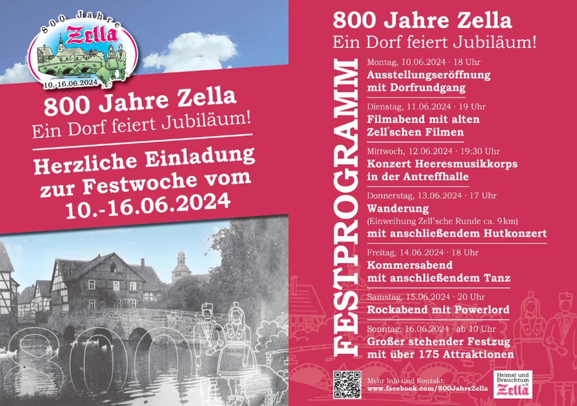 Die offizielle Festwoche startet am Montag, dem 10. Juni, mit einer Dorfwanderung, bei der die historischen Gebäude Zellas vorgestellt werden. Im Dorfgemeinschaftshaus wird danach eine Ausstellung historischer Bilder eröffnet. Am darauffolgenden Tag stehen alte Filme über Zella auf dem Programm.