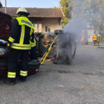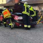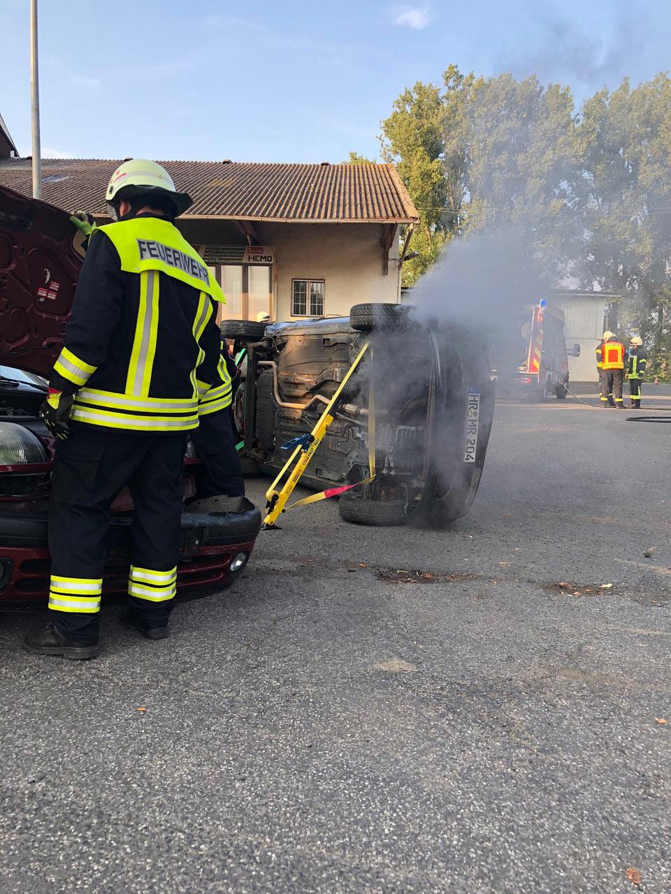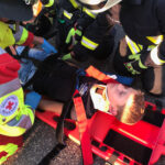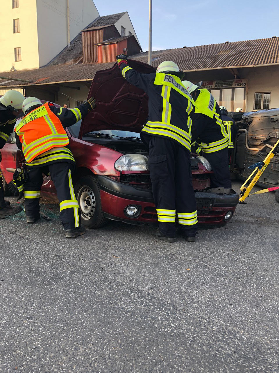 Um die unterschiedlichen Szenarien abzuarbeiten, gingen die Feuerwehrleute im Team vor. An dem angenommenen Verkehrsunfall waren mehrere Pkw beteiligt, sechs verletzte Personen wollten aus den Unfallwracks gerettet werden. Dabei hatte jedes Fahrzeug seine besondere Herausforderung. Mit der Hilfe von Pyrotechnik fingen zwei der drei Pkw Feuer, das zunächst gelöscht werden musste.