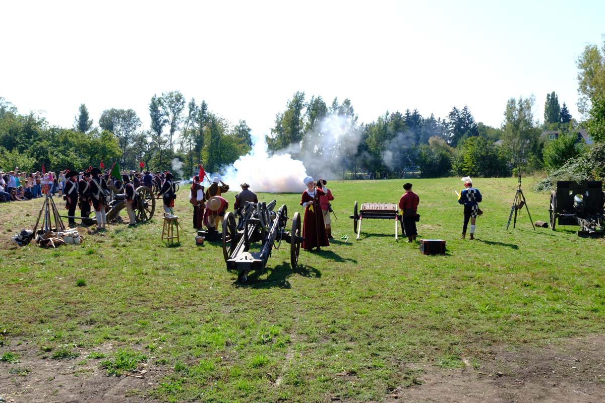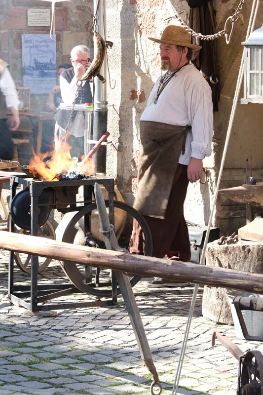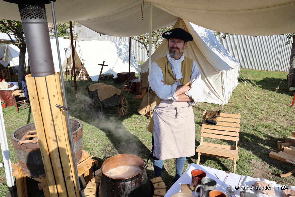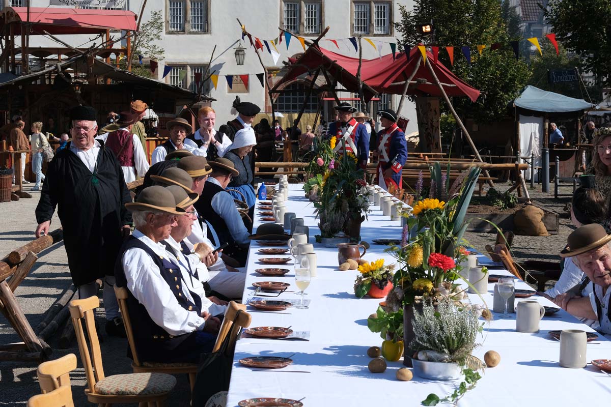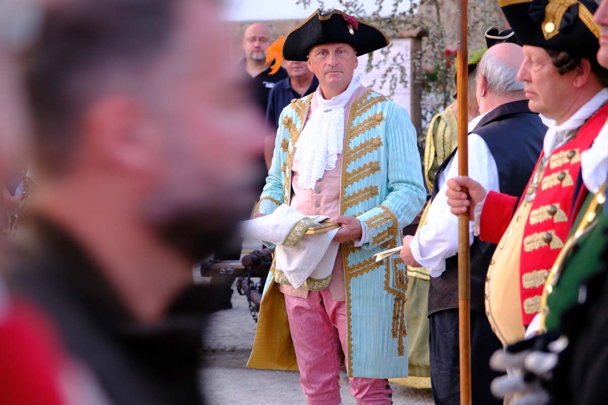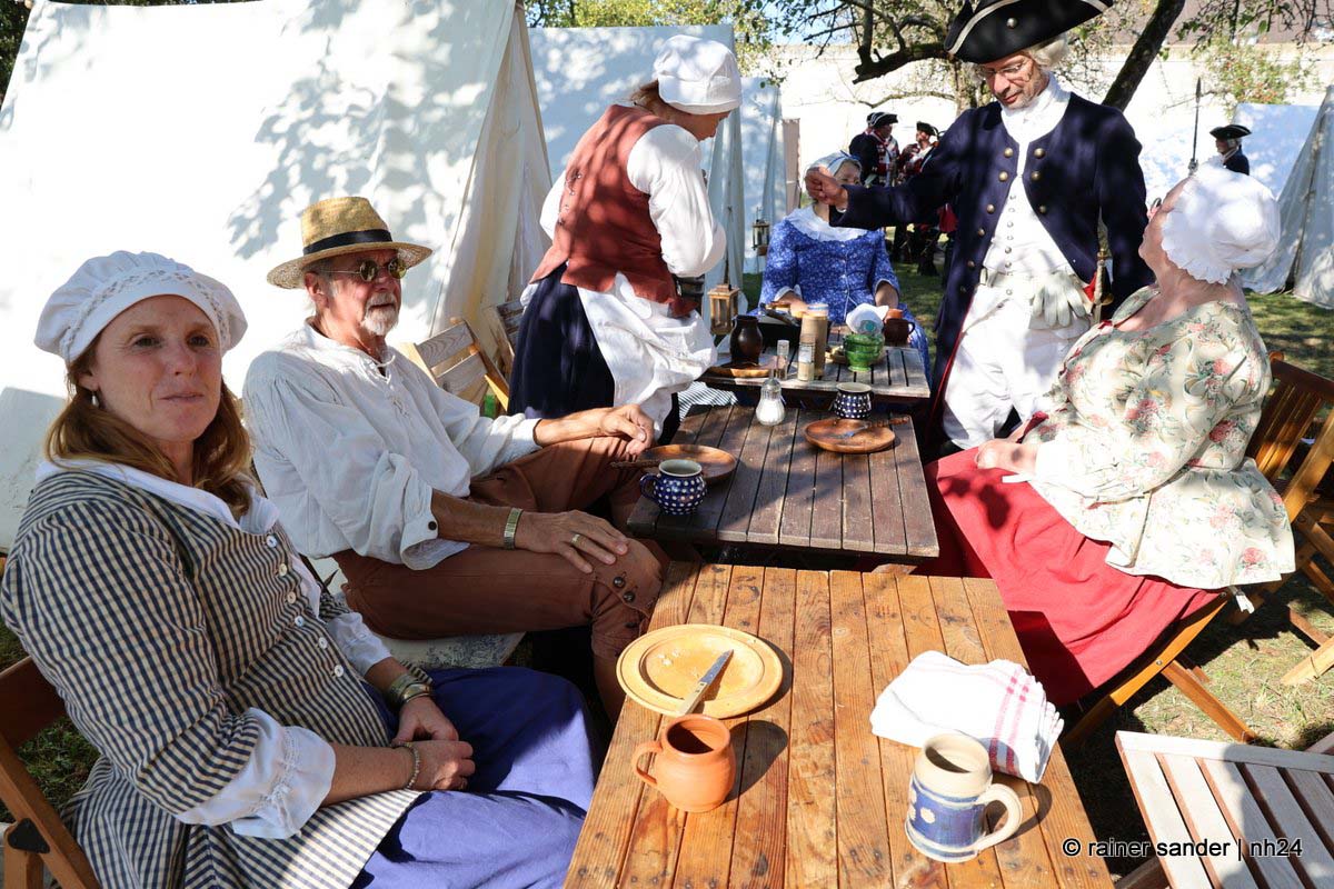 Jedenfalls nicht mit 1.100 Akteuren in Uniform, als Handwerker oder Händler, als Künstler oder Darsteller, als Musiker oder Geschichtenerzähler. Nahezu im gesamten Festungsbereich sind Stände aufgebaut, werden historische Szenen nachgespielt, Schlachten geschlagen, im Dekanatshof immer wieder die Konfirmation begründet, im alten Pferdestall zweimal getafelt oder an der riesigen Tafel auf dem Paradeplatz immer wieder von Landgraf Karl die Kartoffel angeboten und diesmal von den Bauern nicht der Salat vorgezogen.