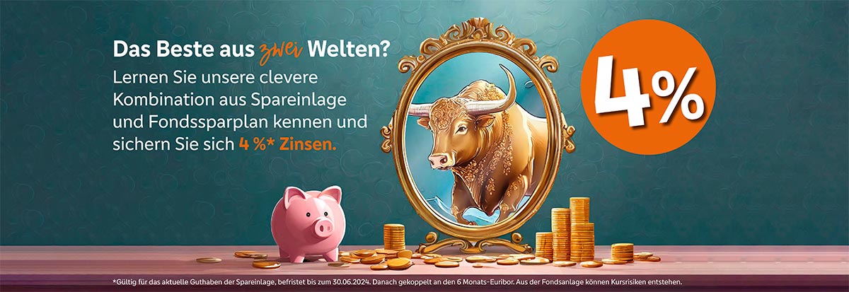 Gerne informieren wir Sie näher zu diesen Themen und zeigen Ihnen auf, welche Anlageformen für Sie infrage kommen können. Sprechen Sie uns an, wir beraten Sie gerne. Interessant könnte bei dem oben skizzierten Umfeld unser AnsparInvest sein, die clevere Kombination aus Spareinlage und Fondssparplan. Details erhalten Sie hier: vrbank-hessenland.de/4Prozent (Beitrag von Oliver Wieber, Bereichsleiter Private Banking der VR Bank HessenLand eG/Anzeige)