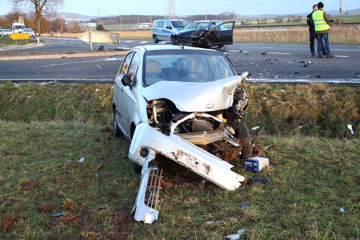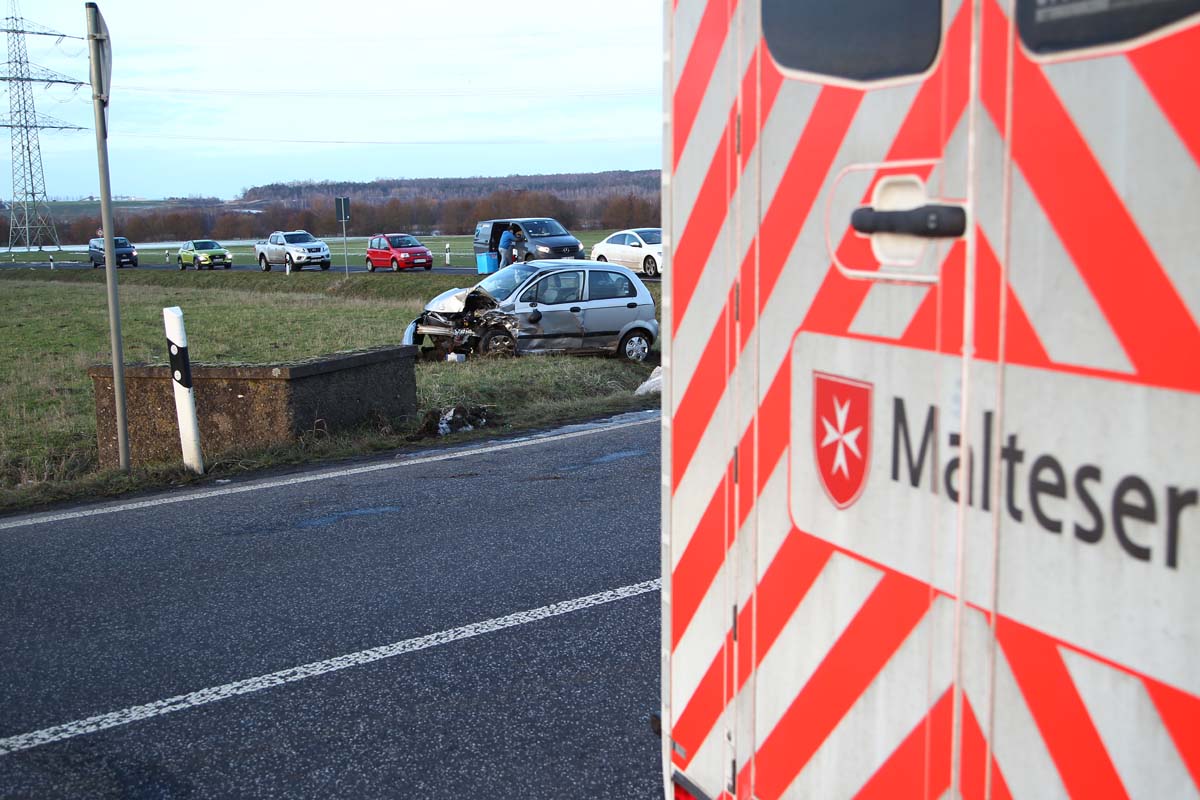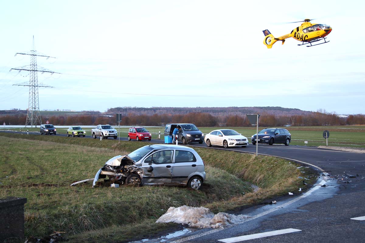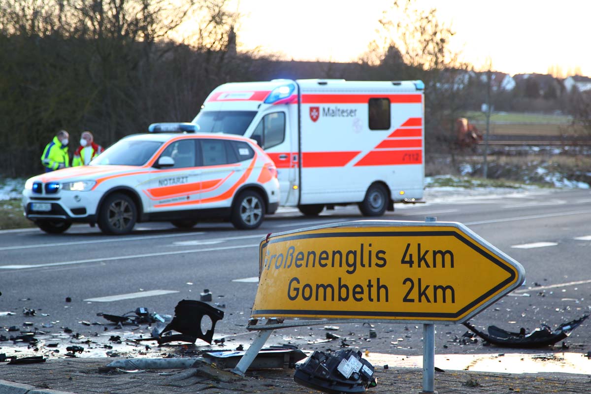 Beim Abbiegen kam es zum Zusammenprall der beiden Autos. Während sich der Golf auf der Fahrbahn drehte, überfuhr der Kleinwagen die Verkehrsinsel auf der Kreisstraße in Richtung Gombeth, beschädigte dabei ein Hinweisschild und geriet in der Folge von der Fahrbahn ab. Das Auto fuhr einen etwa zwei Meter tiefen Hang hinab und kam auf einer Wiese zum Stillstand.