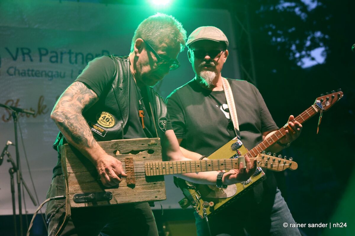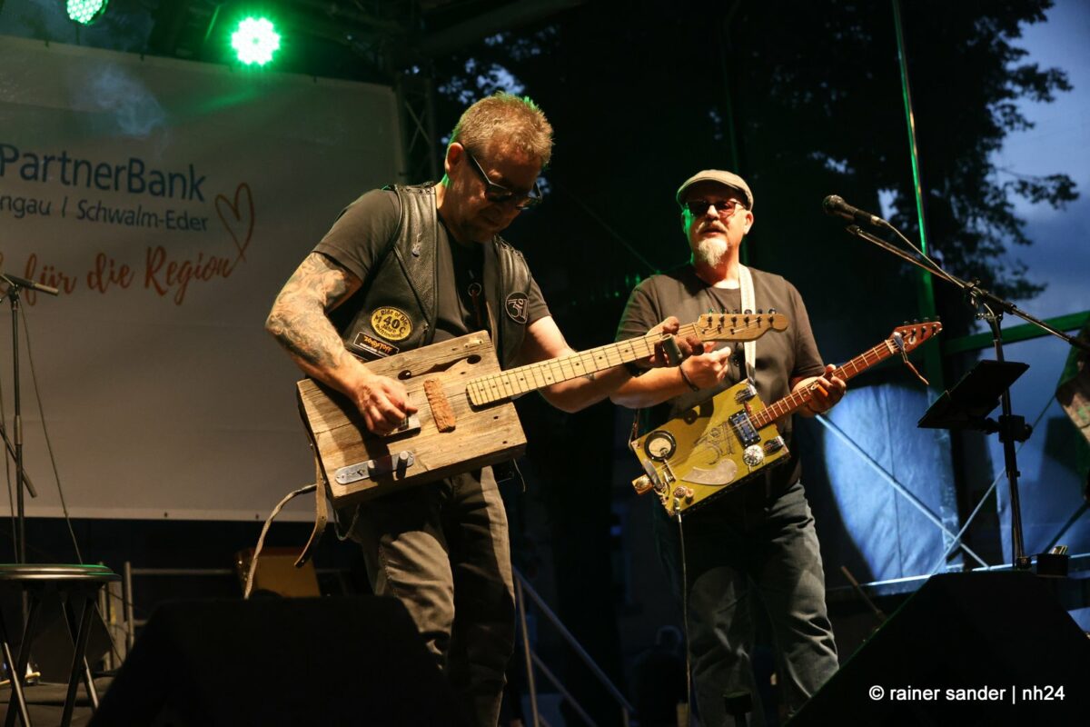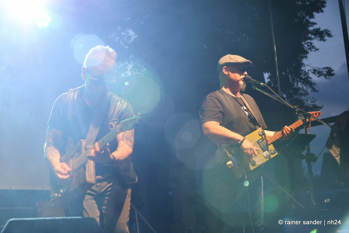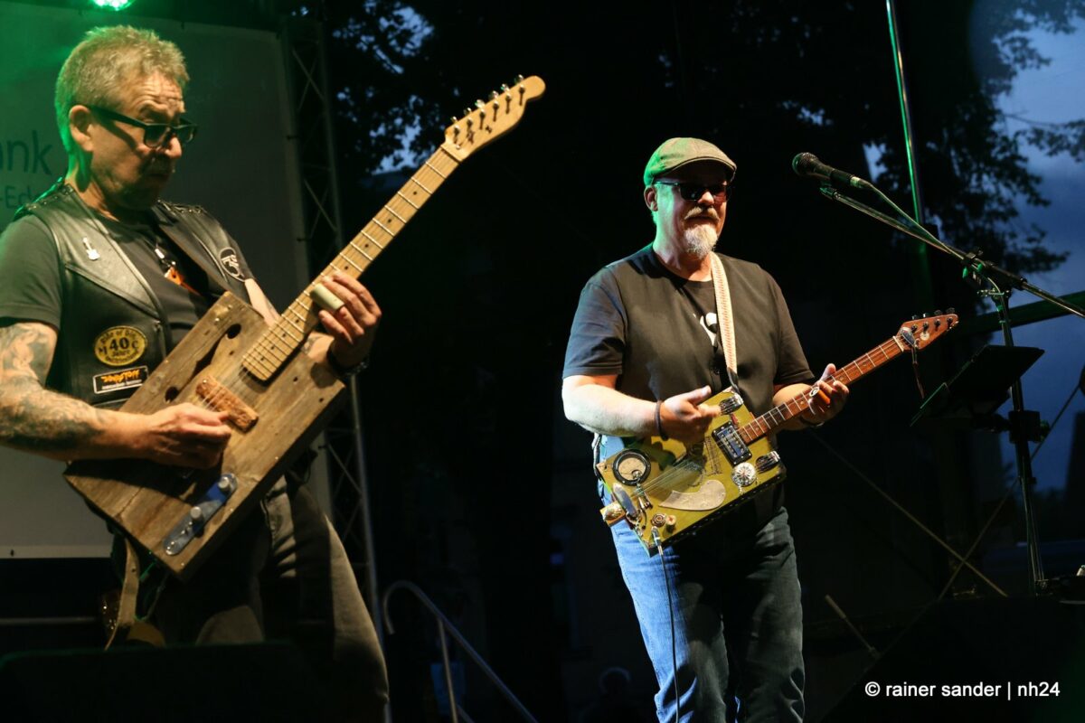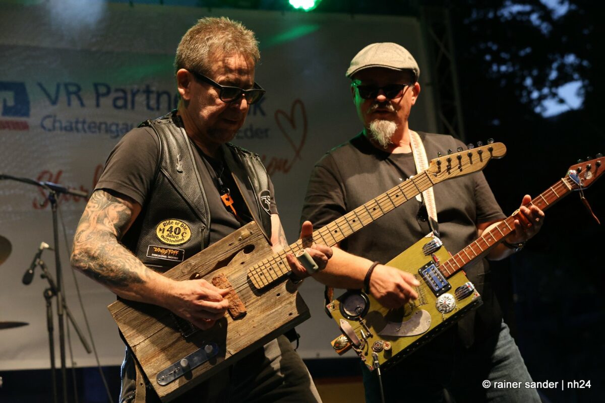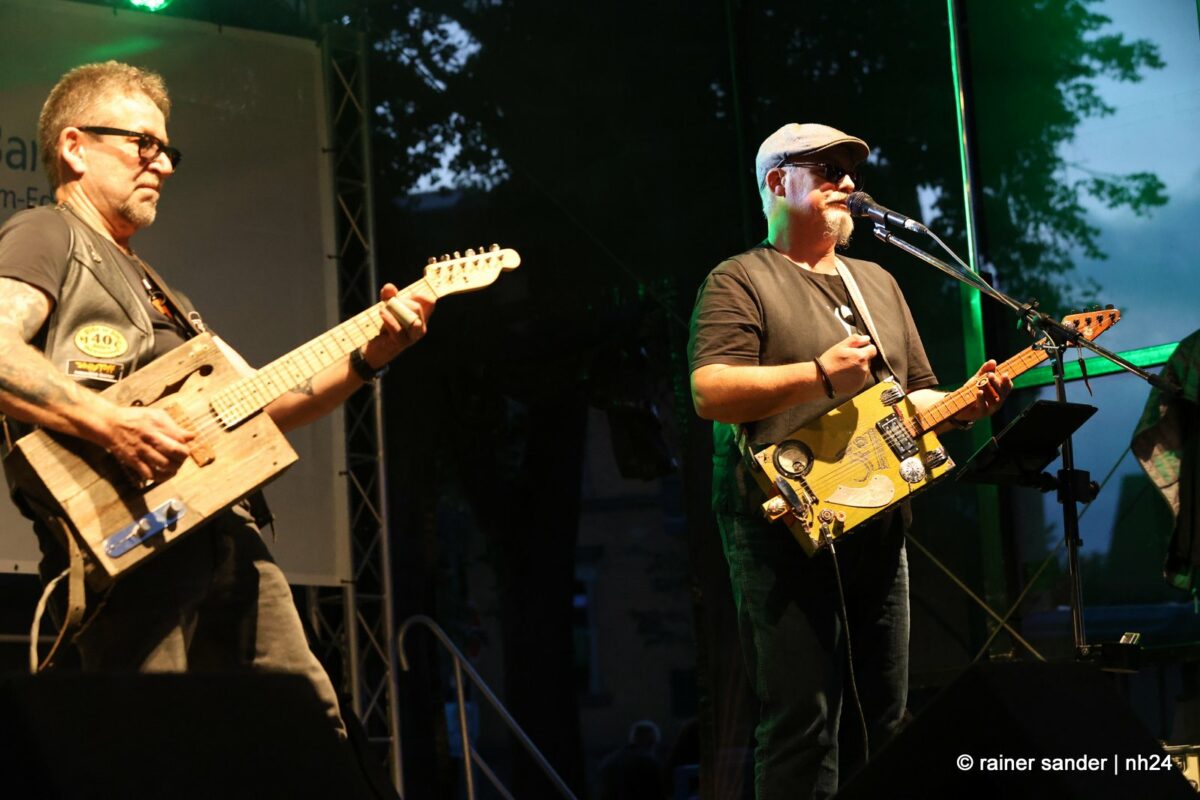 Ein Kinderkarussell alter Bauweise erfreut die jüngeren Besucher und ist auch abends noch frequentiert. Zum Auftakt am Freitag hat Mike Gerhold erfolgreich dem Regen getrotzt. 3 to 1 hatten es mit ihren selbst gebauten Cigar-Box-Gitarren gestern wesentlich leichter unter heiterem Himmel. Michael Dittmar, Karsten Müller und Andreas Großmann spielten klassischen Blues und Southern Rock.